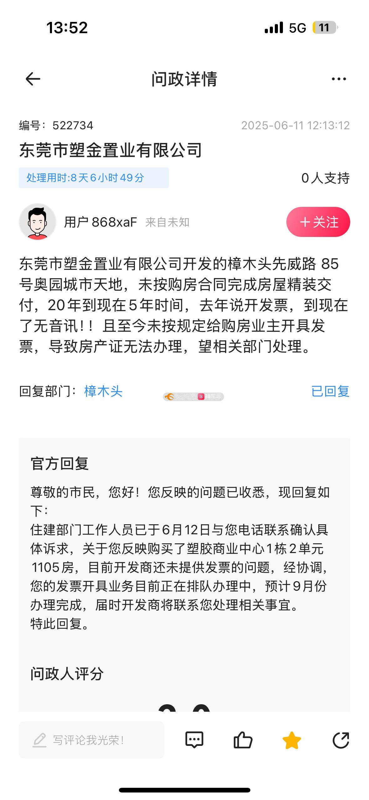 东莞市塑金置业有限公司开发的樟木头先威路 85号奥园城市天地,未按购房合同完成房屋精装交付,20年到现在5年时间,去年说开发票,排队到现在了无音讯!!且至今未按规定给购房业主开具发票,导致房产证无法办理,望相关部门处理。