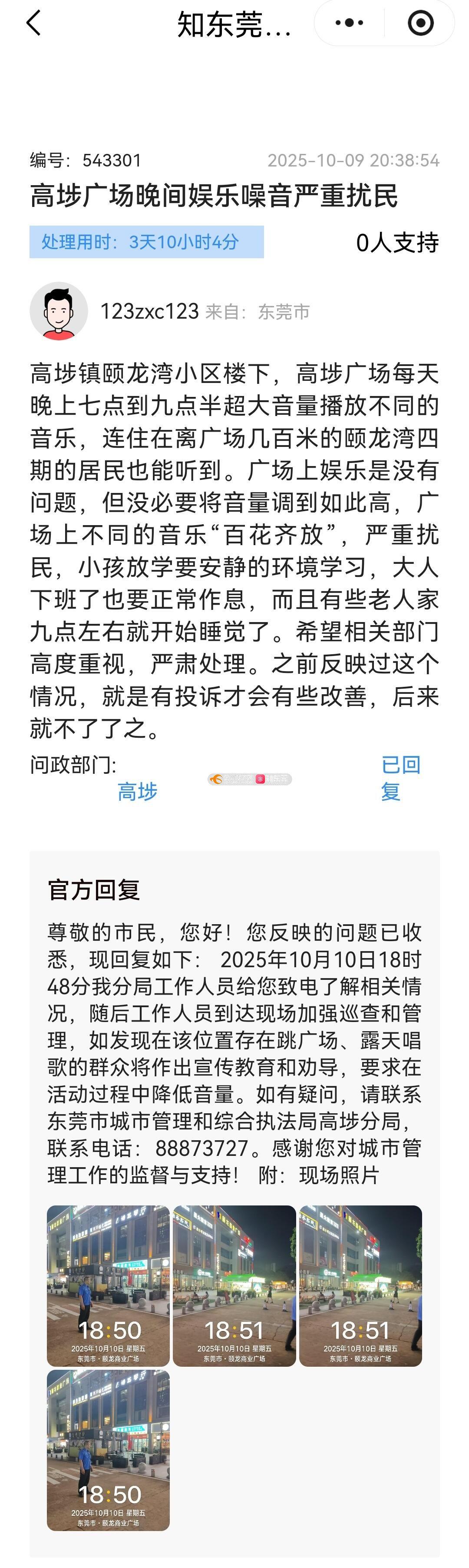 于10月9日投诉反映的是高埗广场噪音问题(高埗只有一个高埗广场,位于镇政府的南面),但回复处理是高埗颐龙广场的巡逻和管理相关,与反映事实处理不符。