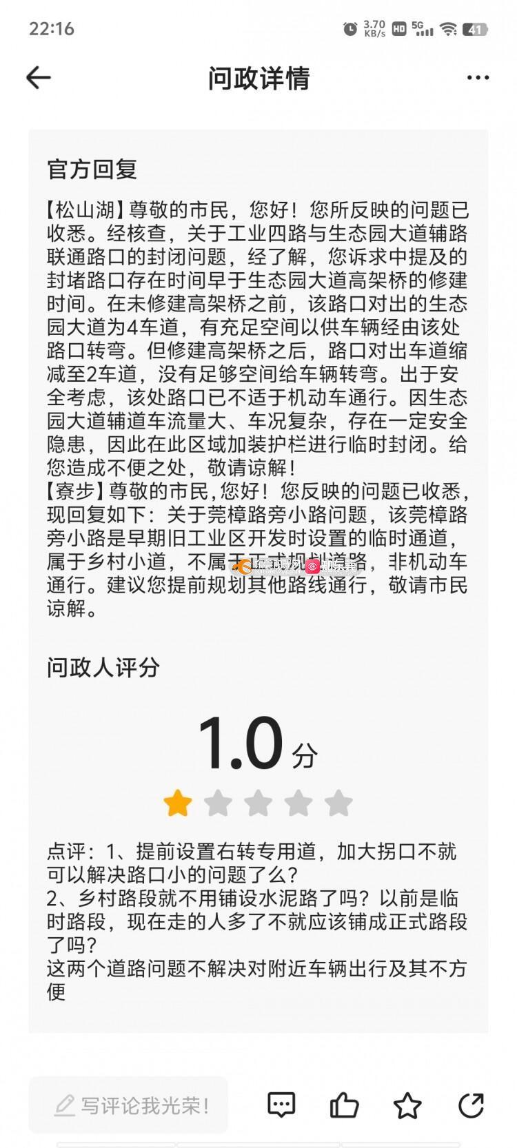 1、工业北四路往生态园大道方向有一个断头路口,常年封闭,不便于出行。 2、断头路旁边泥巴路很烂,旁边的幼儿园多,很多家长小孩通过都要躲避车辆,并且坑坑洼洼很危险,并且不符合松山湖的市容市貌。 专家回复无法解决,个人建议: 1、提前设置右转专用道,加大拐口不就可以解决路口小的问题了么? 2、乡村路段就不用铺设水泥路了吗?以前是临时路段,现在走的人多了不就应该铺成正式路段了吗? 这两个道路问题不解决对附近车辆出行及其不方便