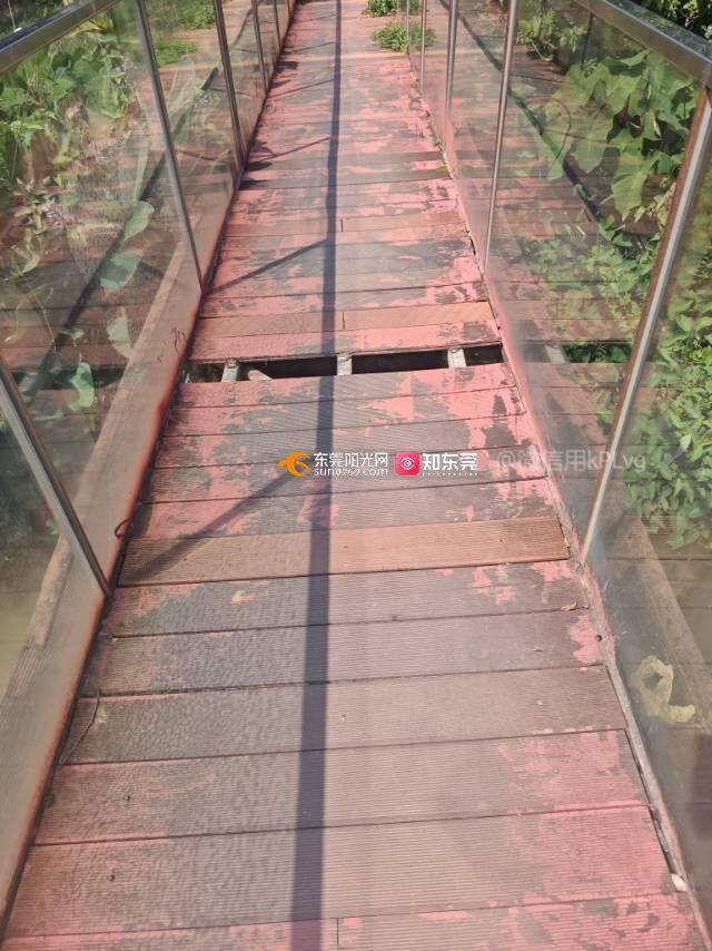 松山湖勾谷公园玻璃桥防腐木损坏存在安全隐患