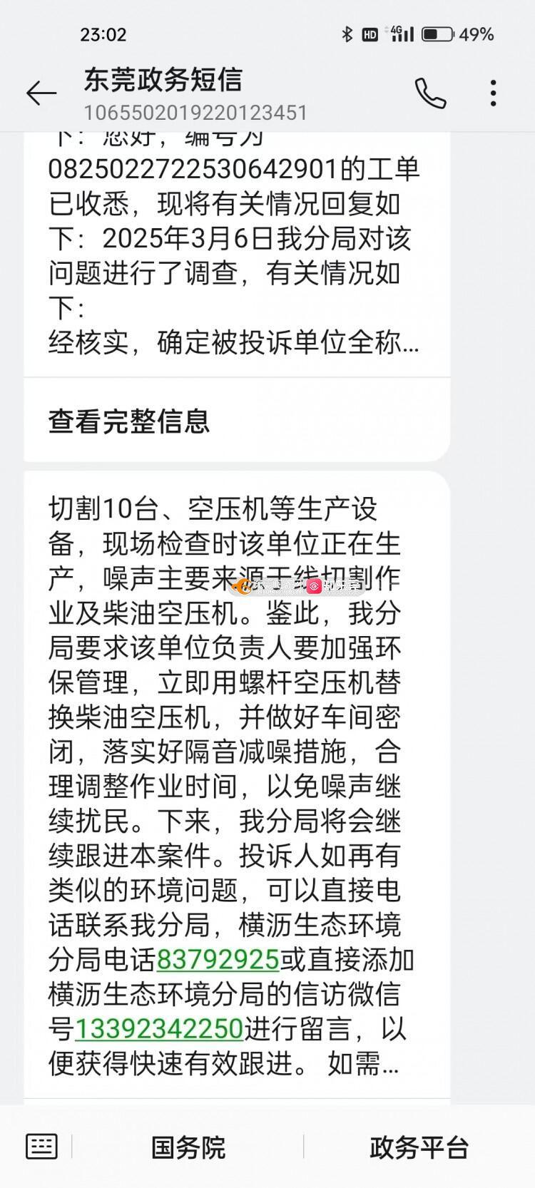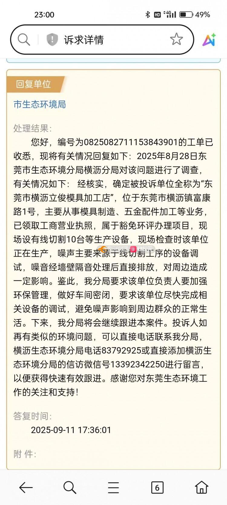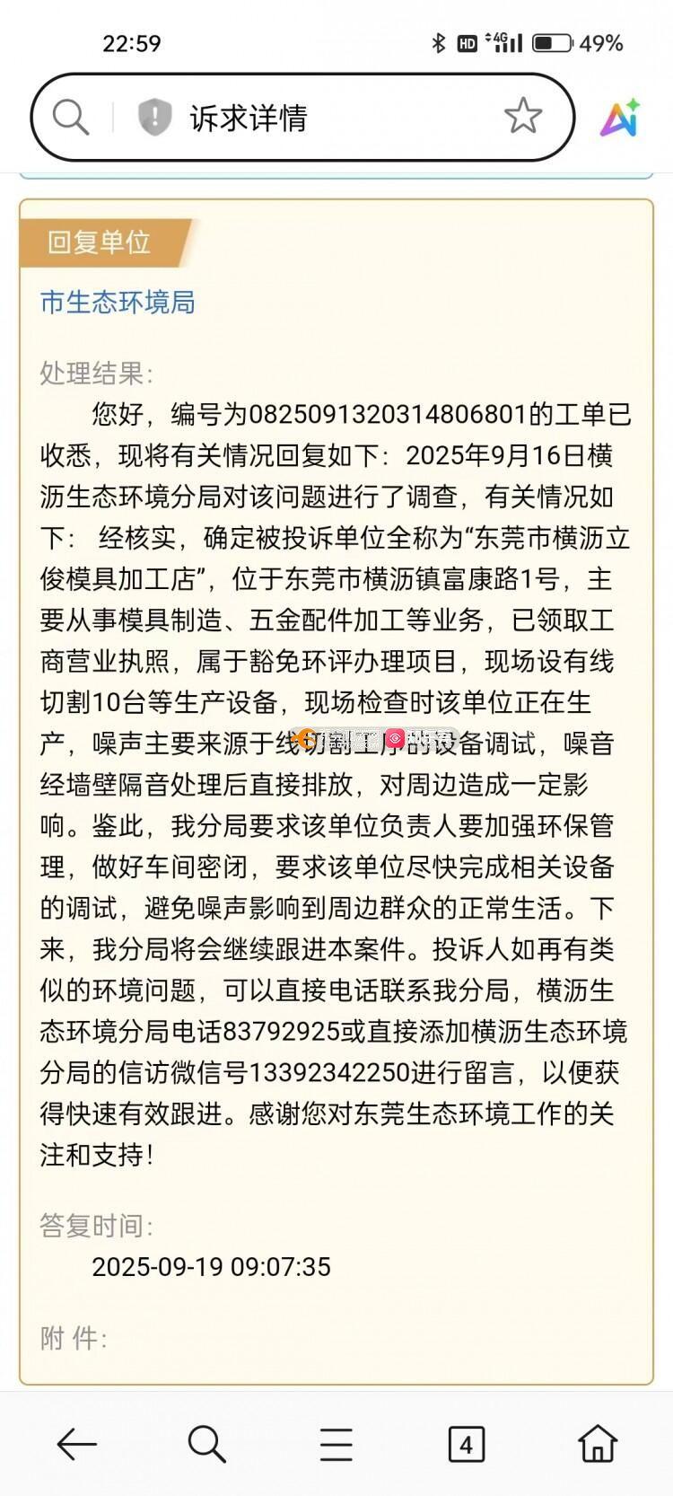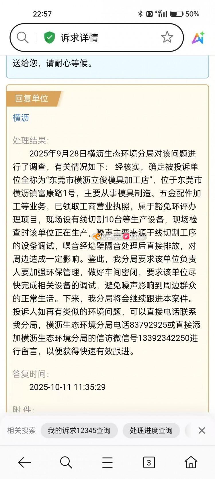 从三月份投诉至今。横沥环保多次回复会督促改企业整改。但从未见期有变化。每次回复都是复制黏贴上一次的结果,企业依旧我行我素24小时开工。是企业保护伞太硬,还是相关职能单位没有作为,压根没有过来现场查看,做噪音检测?我诉求就是晚上过7点后不能生产,或者该企业搬离。本身就是生活区,你要24小时可以进工业园,没人管你