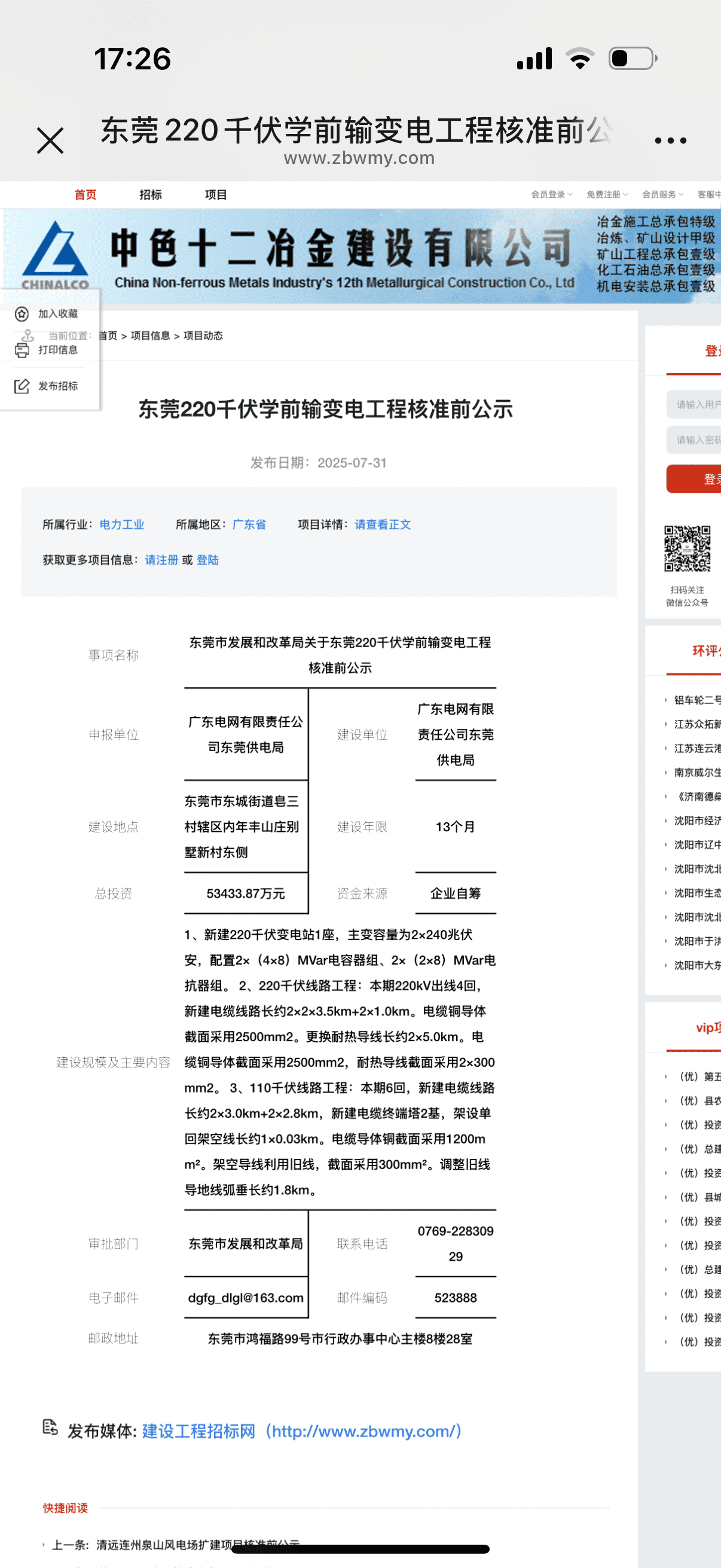 最近我留意到建设工程招标网于2025年7月31日有发布”东莞220千伏学前输变电工程核准前公示“,上写的审批部门是东莞市发展和改革局。请问这个项目公示是否属实。如属实,这个公示具体情况是怎样的?什么时候公示,公示期有多久,在什么渠道公示?