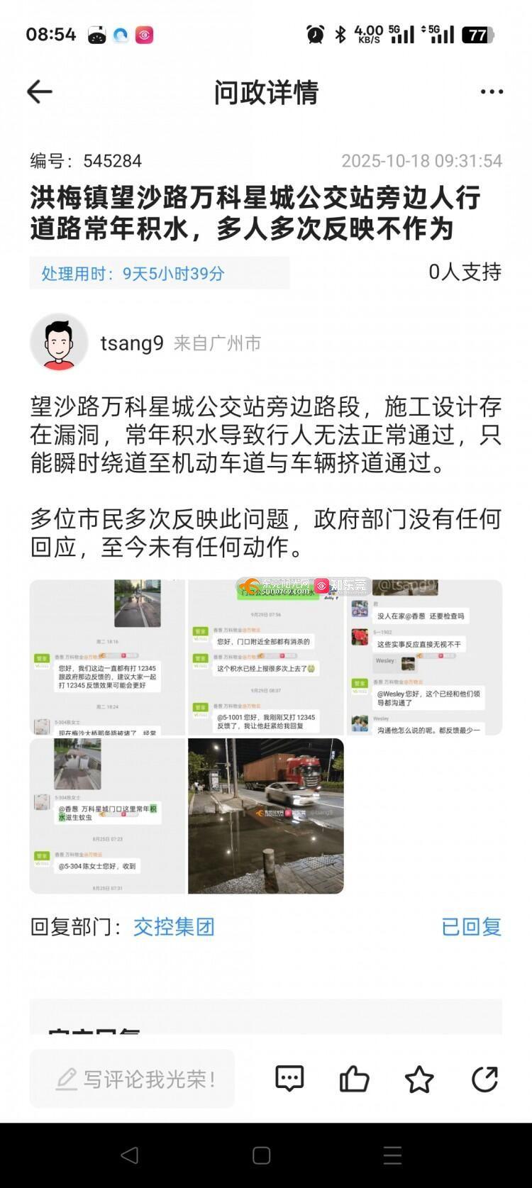 洪梅镇万科星城公交站附近道路常年积水,十几位市民及小区物业多次向12345投诉反馈,至今没有任何部门正面回应相关责任及处理改善。 前问政编号545284,交控集团回复,沿线排水系统于2023年7月移交洪梅镇水务工程运营中心,主线路于2024年6月移交市公路事务中心! 现此众多市民关注且需改善的常年积水问题,到底该应由哪个部门出来处理!? 终究到底有没有部门关注众多民声反馈的出行安全,环境污染积蚊虫问题,能不能有部门出来改善?!