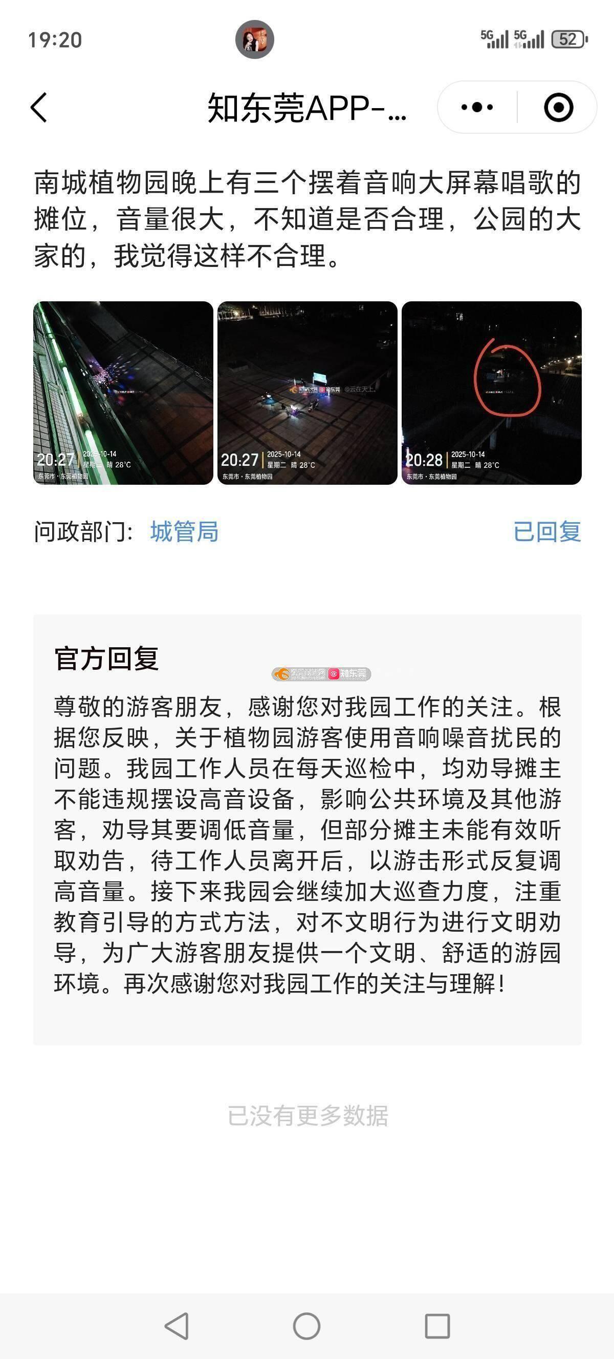 东莞市植物园广场那里,有三个摆着大功率喇叭和投影的卡拉OK的经营性摊位,给大家唱歌,本来这里是供市民休闲乘凉运动的场所,每天晚上唱的鬼哭狼嚎的,那个声音吵的要死,希望相关领导过来听一听,别总坐在办公室办公,这种情况,水濂山那个碧玉湖公园,南城体育公园,南城中心广场,旗峰公园,虎英公园等等公园,都没有这种情况,我想知道为什么偏偏植物园有,是其他公园管理的好吗?是没人管还是管不了?或者是敷衍性的管一下?