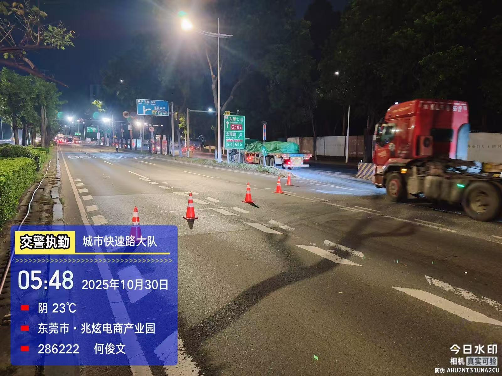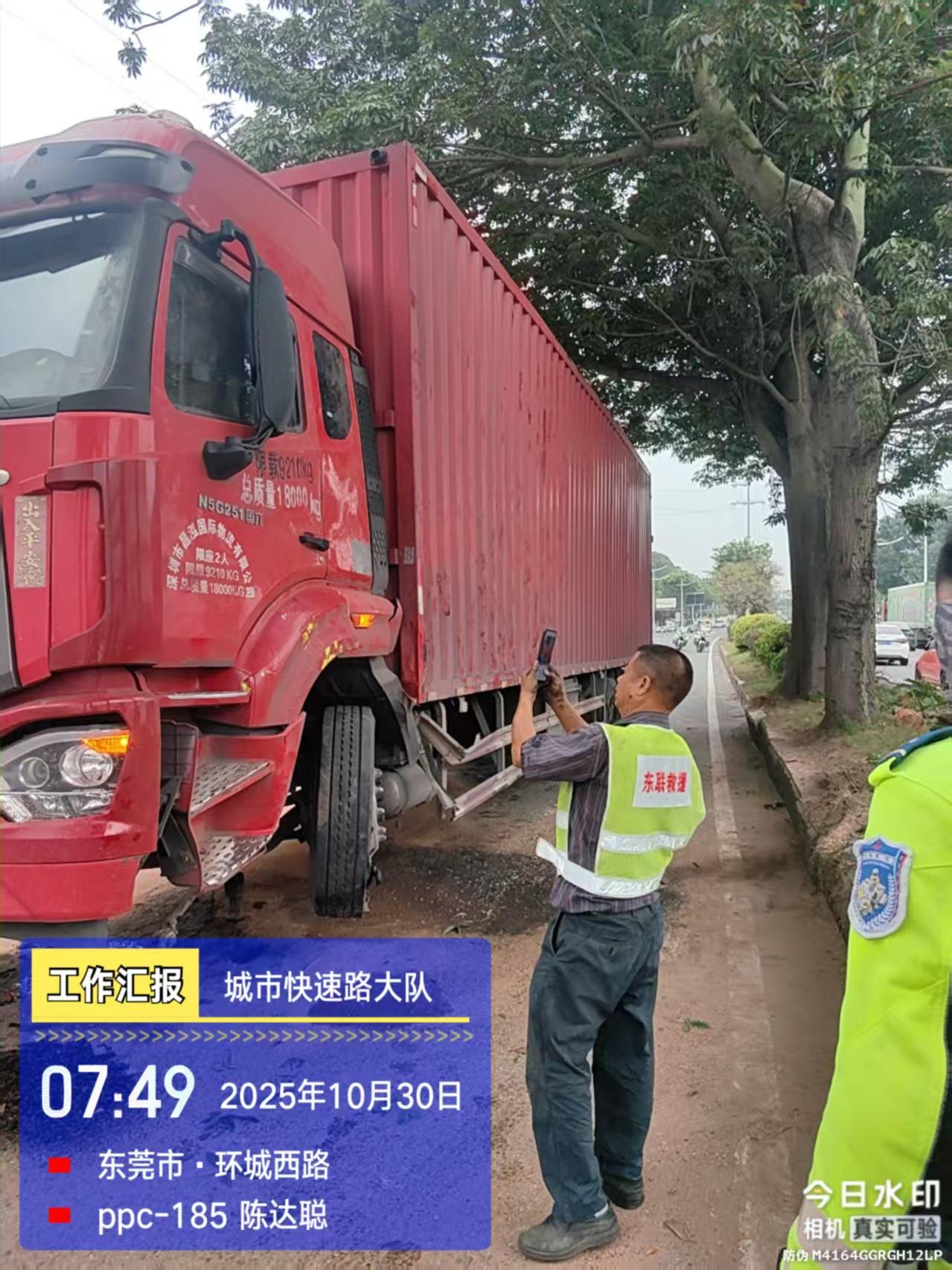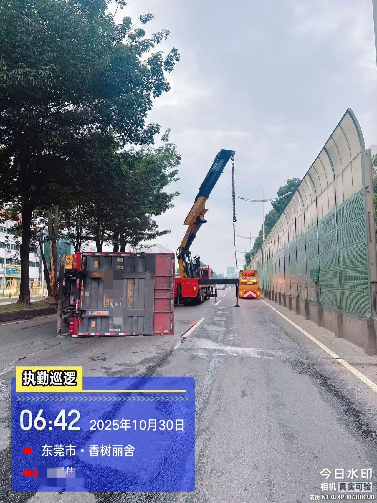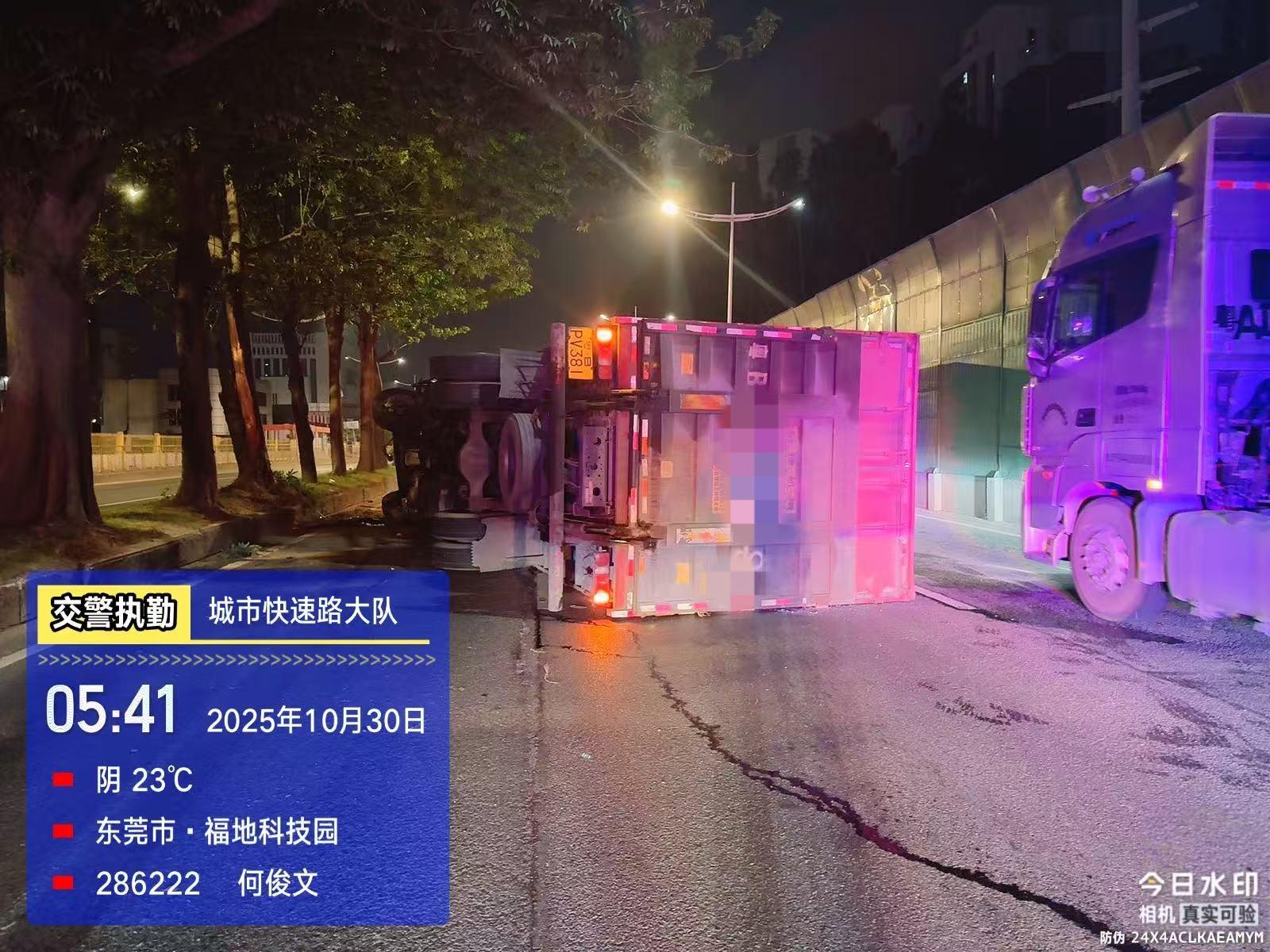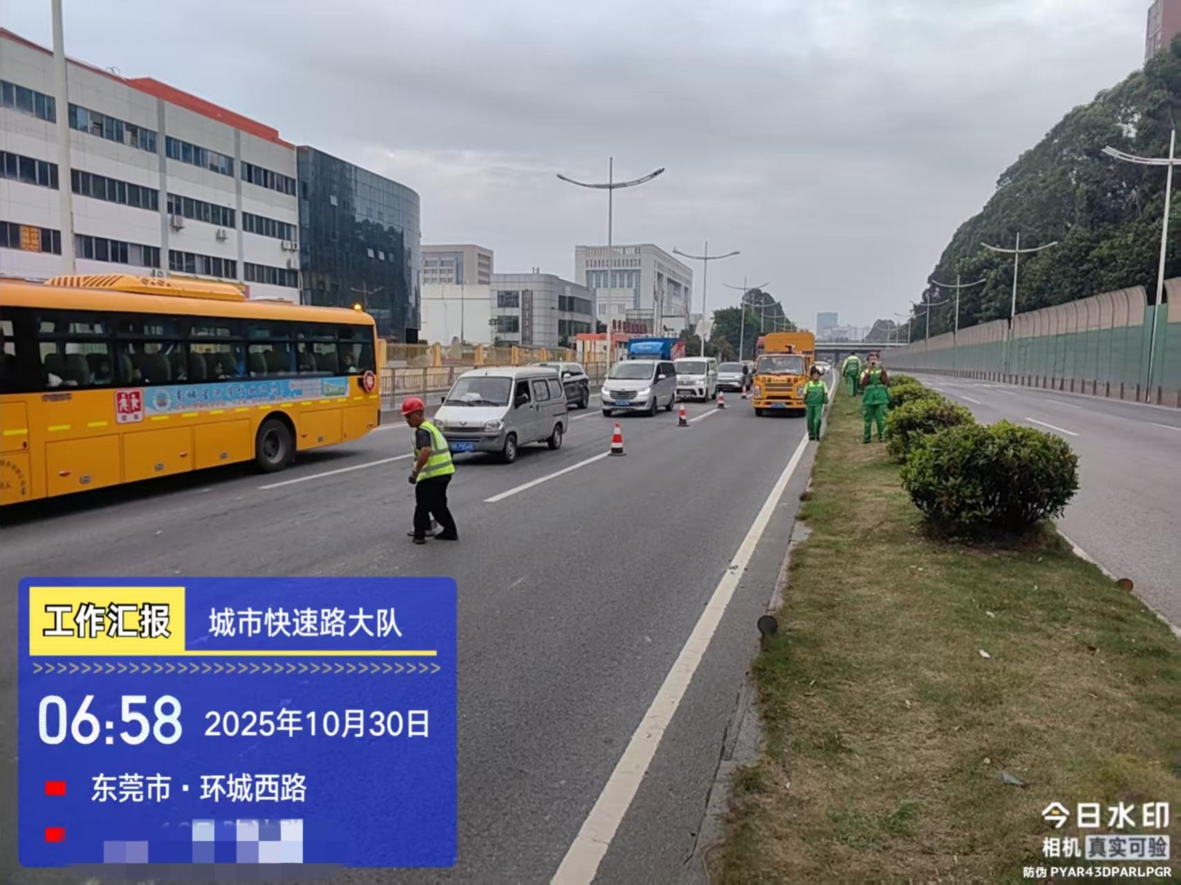 尊敬的市民,您好!来信内容已收悉,现由城市快速路大队答复如下: 一、事故基本情况。经倒查核实,2025年10月30日上午(5时36分许),我大队接报警情称,位于环城西路福地科技园对出主道路段,发生一起两重型货车碰撞的交通事故,其中一重型货车发生了翻车,该车驾驶员受伤。我大队警员迅速赶到现场后发现翻侧的货车斜跨在主道最左侧和中间车道上,且翻侧货车由于撞击,导致车辆的机油泄露到路面三车道上,另路边一树木被该货车撞击导致大量数值散落在路面,在场警员将上述情形反馈大队及交管支队后,5时48分许收到指挥中心工作命令,暂时对路面三车道进行临时封闭交通管制,做好路面防护,避免途经此路段车辆发生二次事故。同时,警员已通知救援公司、120救护中心、市容环卫中心等部门到场协助处理。6时许,上述部门车辆及人员陆续赶到事故现场,但由于翻侧货车质量较大,且该车辆车轴断裂,救援作业难度较高、耗时较长(作业期间救援吊车需占据最右侧车道),直至7时20分许,上述救援作业完毕,路面树枝及机油进行了清理后,我们立即解除了路面交通管制,道路右侧两车道恢复行车,至7时50分许,将事故货车拖离现场,事故路段恢复正常交通秩序。上述事故处置过程中,我们有安排警力在场防护,以及指引受影响车辆分流至辅道,但由于早高峰车流较大,事故处置时间较长,影响了市民出行,在此我们表示诚挚的歉意。(附上事故处置过程相关工作照片) 二、感谢您对我们工作的监督和建言。上述工作情况已致电您进行反馈,您表示理解,但对交管部门讲事故路段全封闭以及此宗事故处置效率表示不满;相关意见已反馈至我大队领导及执勤部门,下来我们会汲取工作经验教训,进一步完善此类事故处理程序,提高处置效率,保障道路交通安全通畅。如您对上述答复意见有疑问,或对我大队工作有其它建议、意见,欢迎拨打城市快速路大队办公电话(0769-22265006)进行沟通,谢谢!