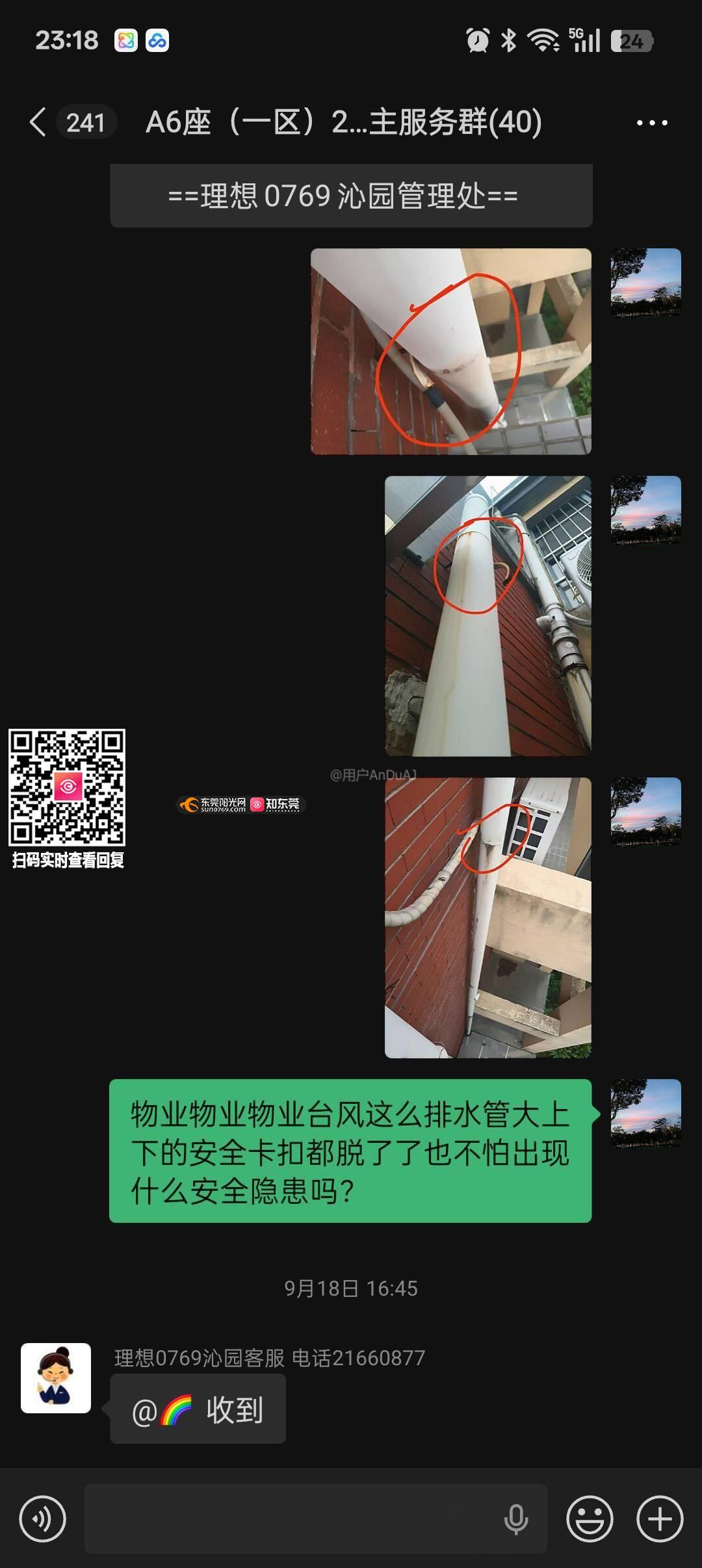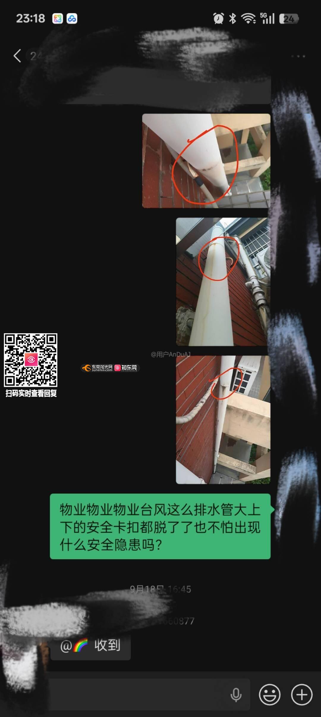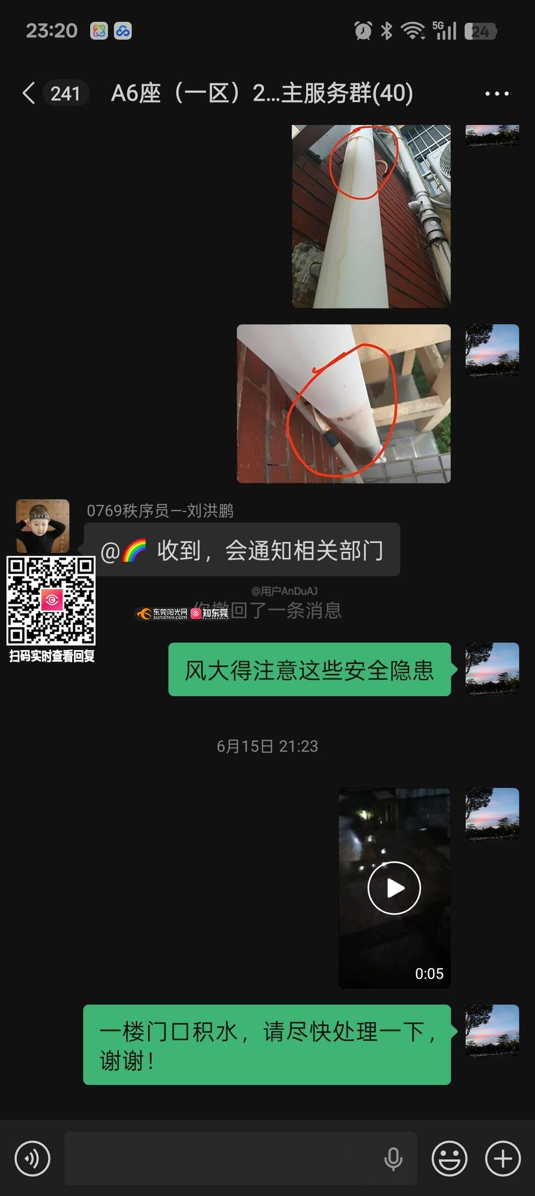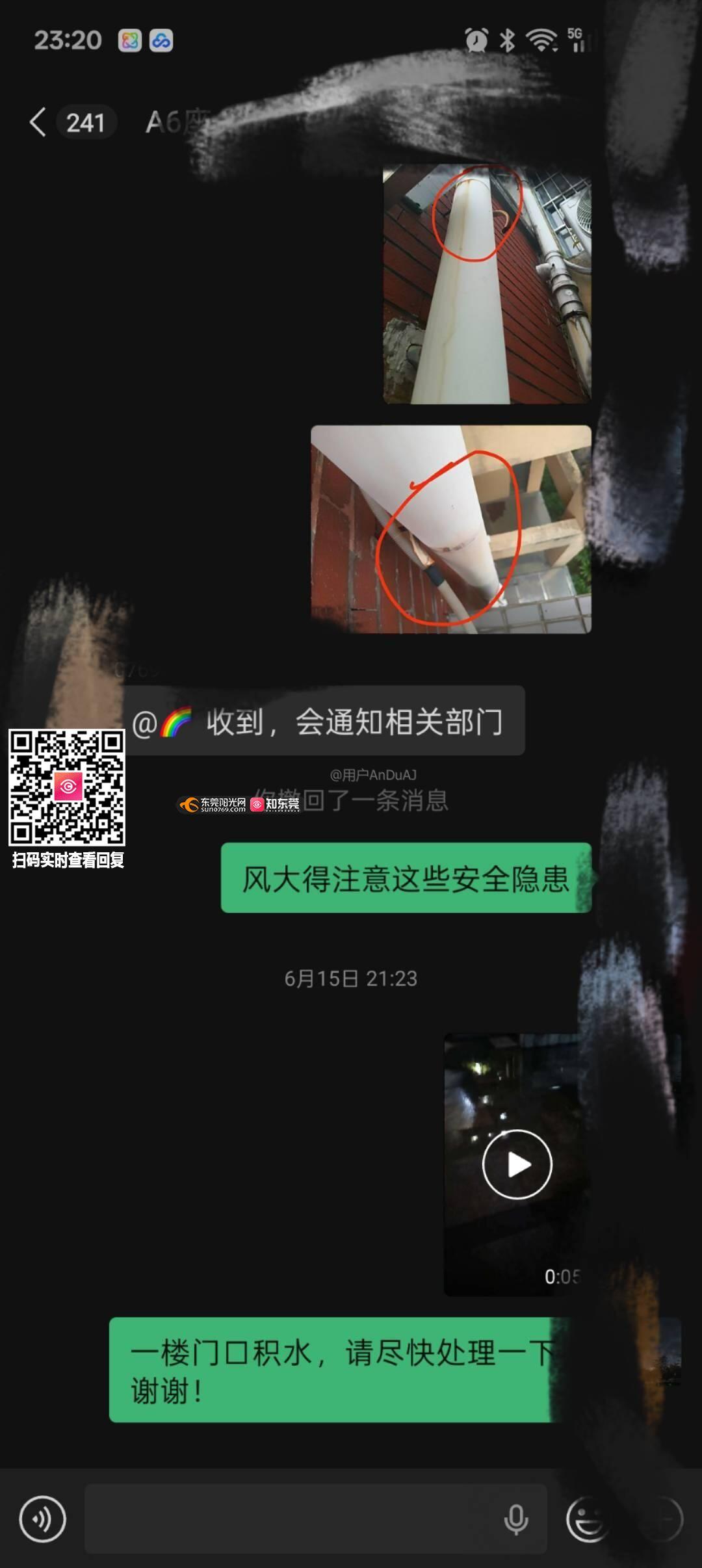 1.房头的树枝对房屋造成安全隐患需要修剪 2.外墙水管的固定抱箍全部脱落,需及时处理 3.单元楼出入门厅位置雨水后积水需处理