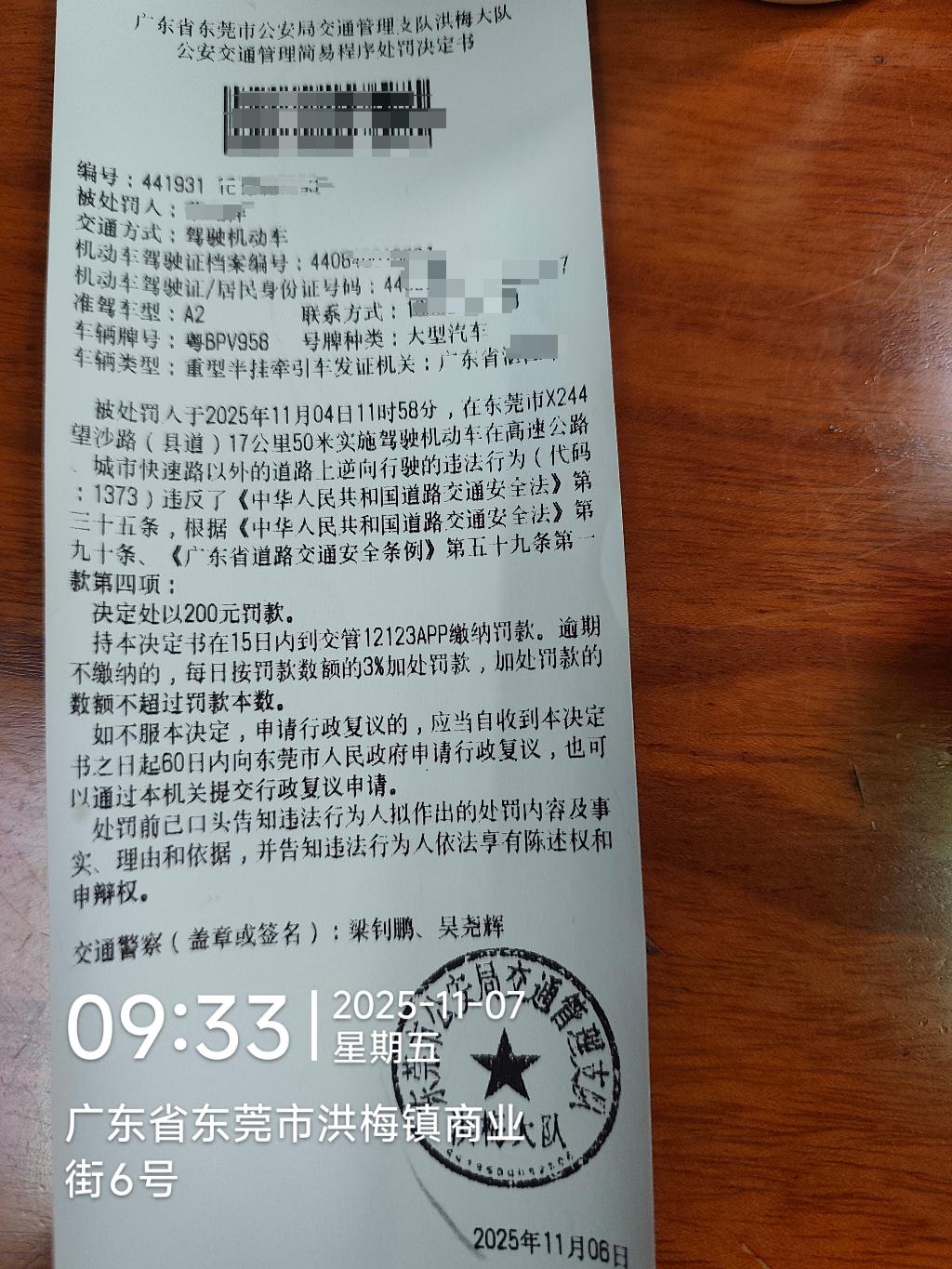 2025年11月4日中午11点57分在洪梅镇望沙路与梅海路交汇红绿灯有一台油罐车逆行驶入鹏欧厂区内,车牌是粤BPV958。这种情况已经发生了多次,严重危害人身财产安全,不知道是否需要等到出人命了,相关部门才会重视。路口监控可查违法行为。 洪梅镇望沙路很多红绿灯没有闪拍,经常有货车,油罐车,泥头车等冲红绿等违法行为。 我已经检举了多回,但从来不知道这些违法行为是否进行了处理,也没有给检举人一个是否已经处理处置等信息。是真的已经处理了还是只是简单的接受了检举没有处理。希望相关部门能够做到接到检举了,也给检举人反馈一个处理结果,最好是能给检举人一个相关的处罚单据来证明是有真的的处理而不是投诉、检举照收,处理不处理是另外一回事。 感谢!