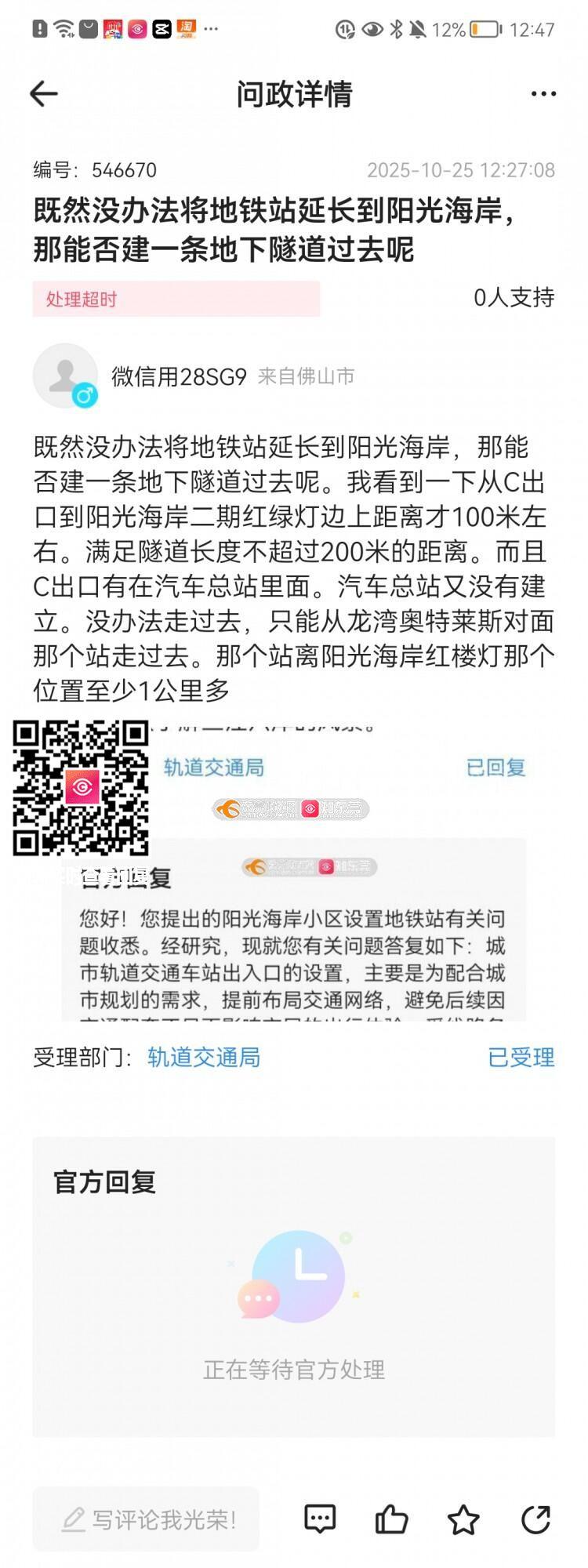 关于东莞市万江汽车总站开条路到阳光海岸这个建议,轨道交通局和万江街道和图储互相踢足球,万江街道说汽车总站属于轨道交通局负责,轨道交通局又说万江街道负责。反正都互相踢足球。那块地都放置4年了,地铁也快通了,先方便人先不行吗?还说到时候封了,可是阅云台那个地铁站却能走到汽车总站里面的地铁站。周末人口最多的就是阳光海岸了,龙湾奥特莱斯有地铁站,阅云台有地铁站,就阳光海岸没有。地铁是为了方便人用的。而不是摆设。应该方便人。而不是不给解决方案互相推脱。(各部门打电话过来很好,但都是互相推脱一个说他负责一个说他负责)