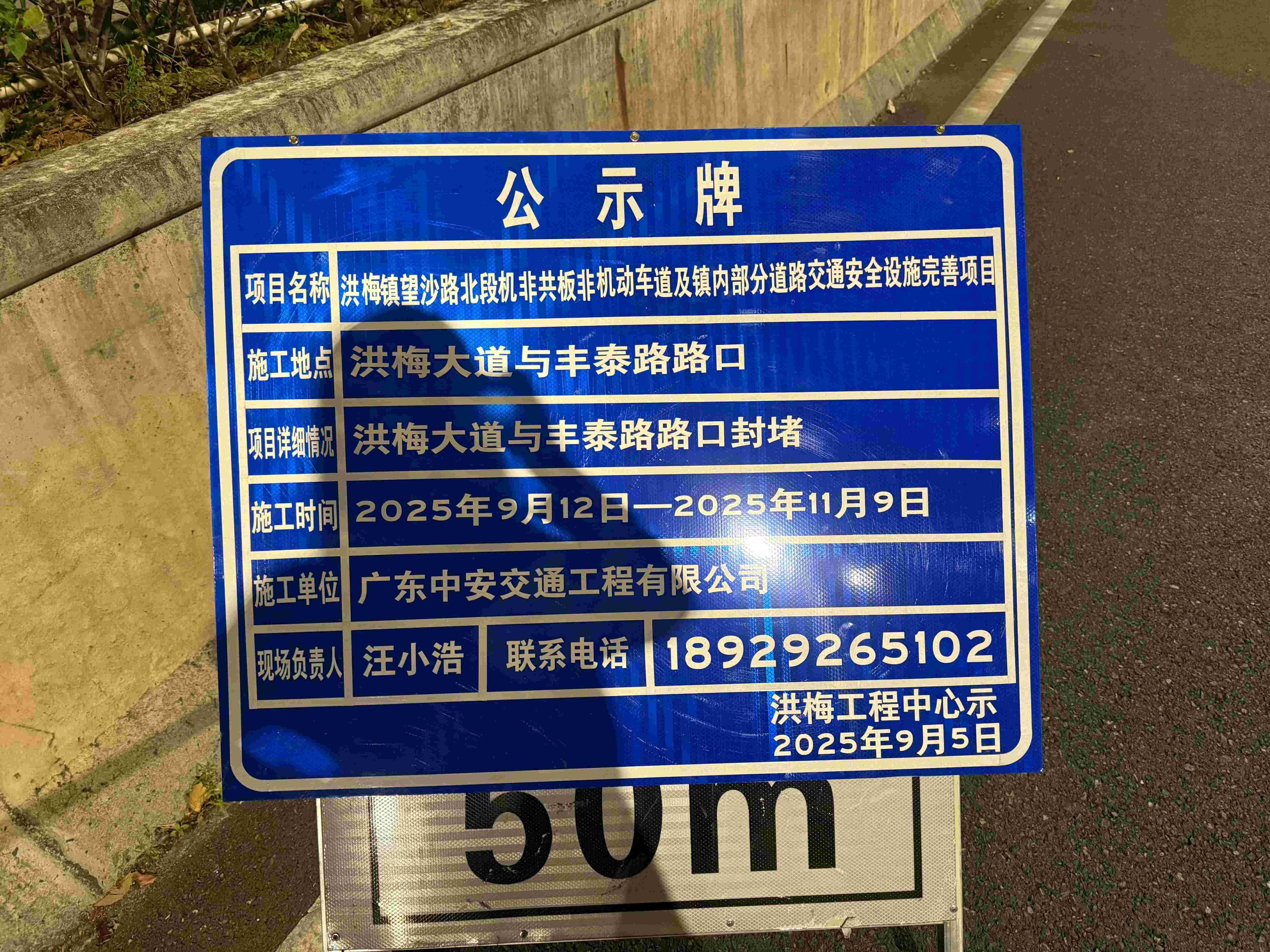 尊敬的市民,您好,关于您反映的问题已收悉,现回复如下:经查,洪梅大道与丰泰路路口考虑到行人、非机动车、机动车等各类道路使用者的安全设置了临时交通信号灯,但经长时间的交通流量监测,绿灯时段常出现无车通行的情况,导致路口整体通行效率低下,影响了区域整体交通效率。同时,该路口与丰景路口间距不足 150 米,不符合《城市道路交叉口设计规程》、《城市道路工程设计规范》以及《城市道路交通设施设计规范》等关于平交路口间距设置的相关要求。为提高路口通行效率、减少交通流交织,经综合评估后采取了封闭措施。封闭措施虽可能短期内影响部分市民的出行习惯,但从长远看是保障道路整体通行安全、高效、有序的必要举措,望理解和支持。封闭路口后,市民可通过邻近的丰景路口、康泽路口出行,相较封闭前,车辆最大绕行距离约 600 米,行人最大绕行距离约300米。洪梅镇望沙路北段机非共板非机动车道及镇内部分道路交通安全设施完善项目,包含的不只是在洪梅大道与丰泰路十字路口增设石墩这一项工作内容。依据《中华人民共和国政府采购法》《中华人民共和国政府采购法实施条例》(国务院令第 658 号)和《政府采购竞争性磋商采购方式管理暂行办法》(财库〔2014〕214 号)等有关法律法规,该项目于 2025 年 07 月 09 日在中国政府采购网、广东省政府采购网、广东智汇城市招标采购有限公司网站登载竞争性磋商公告并同时公示磋商文件、招标控制价、施工图、工程量清单、工期文件、合同文件等资料。获取采购文件时间为 2025 年 07 月 09 日至 2025 年 07 月 16 日,响应文件提交截止时间为 2025 年 07 月 22 日 。该项目由镇道安办牵头调研立项,镇工程中心负责采购实施,整个项目涉及多个道路交通安全设施的完善工作,费用是综合各项工程内容核算得出,具体可通过中国政府采购网(http://www.ccgp.gov.cn/cggg/dfgg/jzxcs/202507/t20250709_24941281.htm)查看。关于您反映洪梅大队沟通态度敷衍的问题,我们了解到在与您商讨封路问题时,虽已明确详细说明该路口封闭原因,但未达到您的预期,由此给您带来不好的感受,我们深表歉意,敬请谅解!