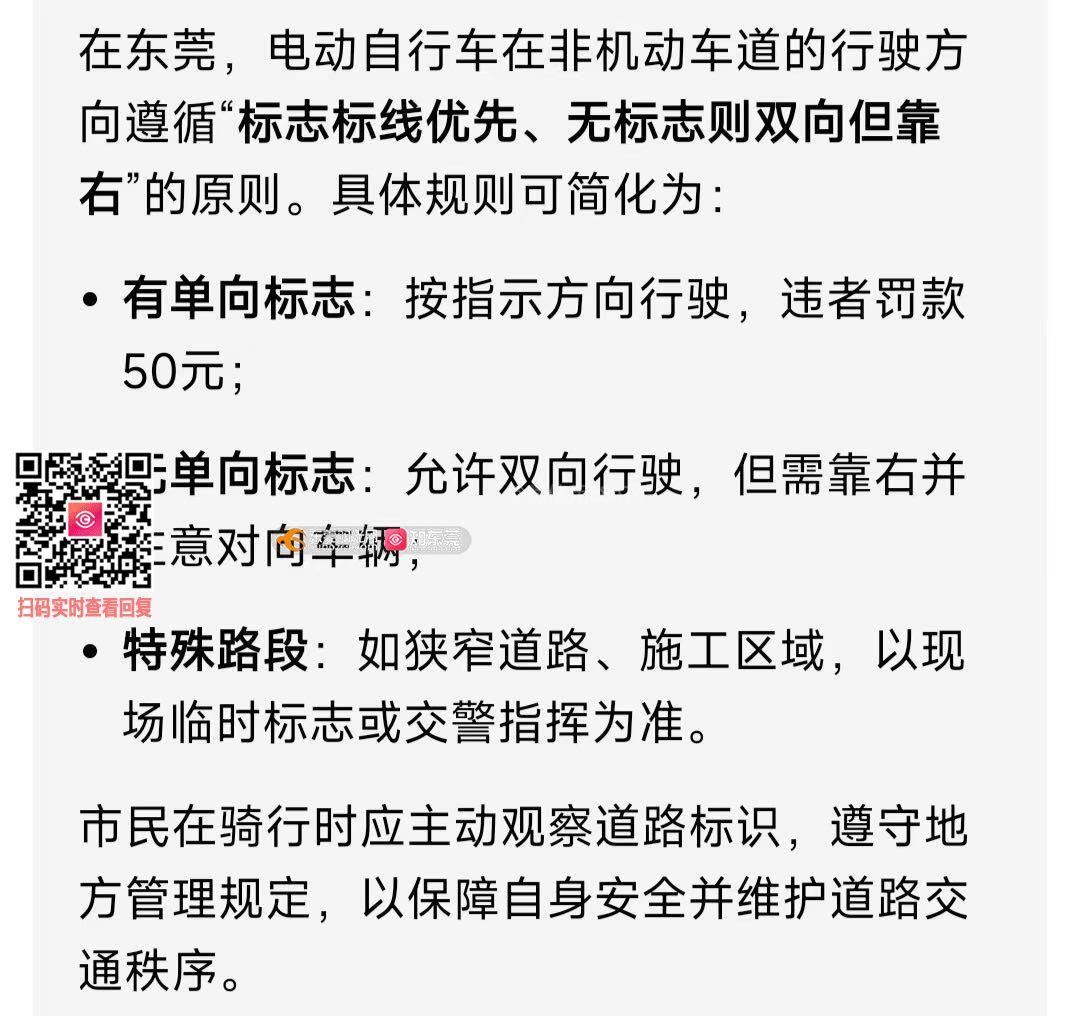 同志你好,请问东莞市内的非机动车道内,是否允许电动自行车双向行驶?我问AI,AI回答我的如图,请问是否正确?