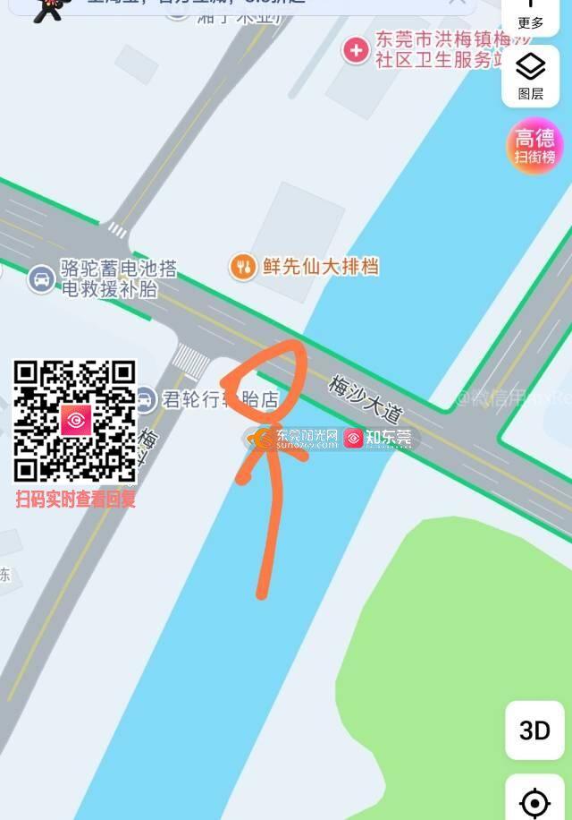 洪梅镇梅沙大道上有一座小桥,人行道中间有一个路灯