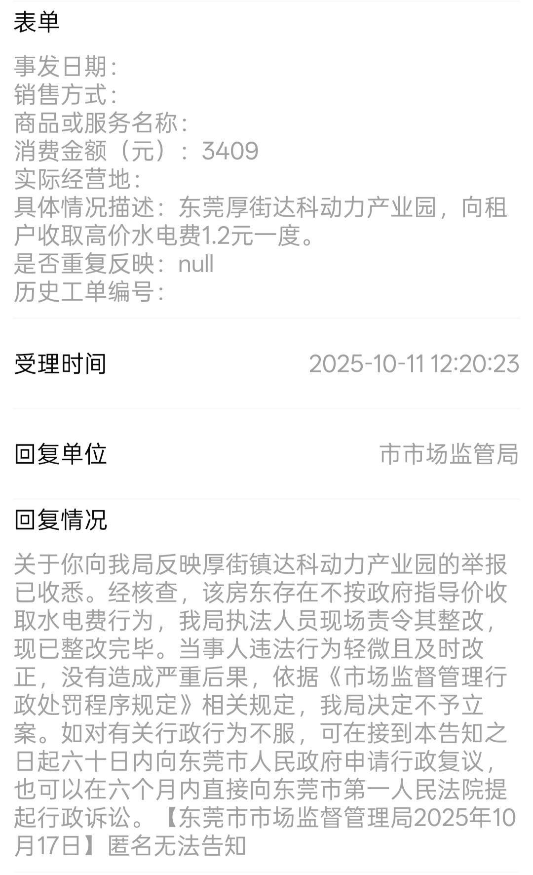 我于[2025年10月11日]通过[电话12345平台书面材料向市场监督管理局]投诉厚街达科动力产业园违法收取高额水电费,但至今未得到有效解决。具体表现为: 投诉后,工作人员仅简单回复“已整改”,未开展实地调查,实际物业2025年11月11日再次向业主收取1.2元一度电费。 工作人员并未责令物业公司整改或退还多收费用; 也未对物业公司的价格违法行为依法立案查处。 这种处理方式严重损害了政府部门的公信力,也纵容了物业公司的违法违规行为。 三、我们的诉求 请求贵单位立即对[厚街达科动力产业园]违规收取水电费的行为立案调查,责令其退还多收费用,并依法予以行政处罚; 要求物业公司公示水电费收费标准、计算方式及收支明细,接受业主监督; 请求对区市场监督管理局]此前处理投诉不力的情况进行督查,追究相关人员责任; 建立长效监管机制,防止此类问题再次发生。 我们已保留相关缴费记录、沟通截图等证据,恳请贵单位高度重视,切实履行监管职责,维护百姓合法权益。希望纪检部门介入