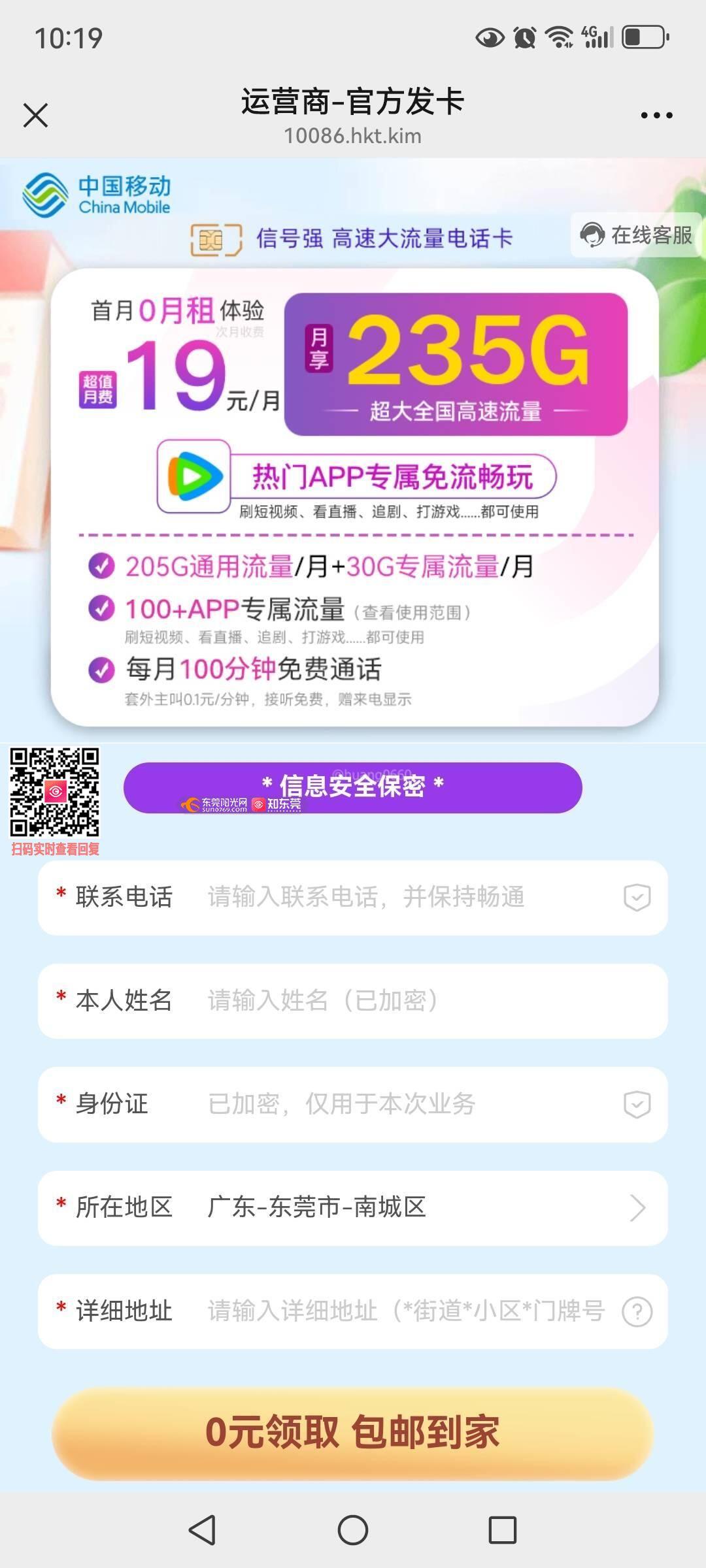 近日朋友圈频繁出现打着中国移动官方旗号的虚假诱人套餐广告,19元235G套餐,假得离谱,经向移动官方求证过为虚假广告,就此也向移动官方监管电话反馈,这里面办卡有要求填个人信息和身份证号,现在境外诈骗团伙用尽方法套取个人重要信息进行诈骗,为何任由骗子骗百姓不管呢,中国移动官方有责任去查证是否真实,假如是假的,应通报公安部门查处,守护百姓财产安全。