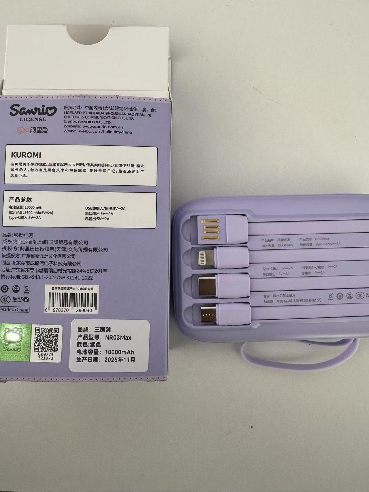 购买平台:得物 订单编号:110187585375747320 发货地:东莞 产品名:三丽鸥家族系列NR03移动电源 实物产品型号:NR03Max 经网上查询 该产品制造商-东莞市成锦信电子科技有限公司并无与产品型号对应的效期内3C认证证书,涉嫌违规销售