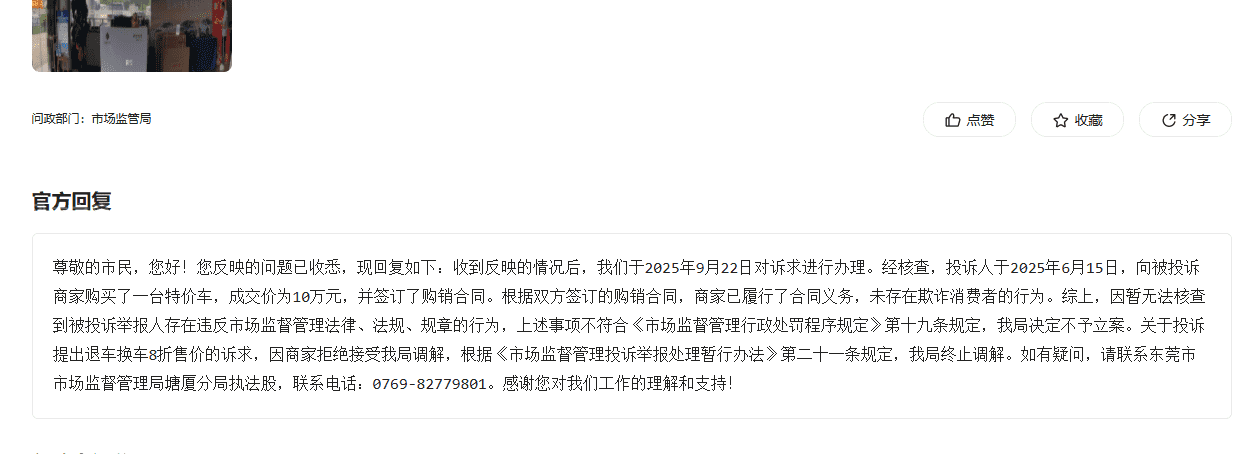 本人近日在塘厦顺利汽车贸易有限公司塘厦分公司购买了一辆宝骏牌小车,到车后,经多方证据发现是展车。而投诉到市场监督管理局塘厦分局,政府方却在帮商家背书,普通老百姓花多年积蓄才买得起的一辆车,有合同有视频有微信为证据,而政府官方却定义为特价车,有没有考虑到消费者的感受?政府机构不是混江湖的,满口胡言乱语,政府单位要依法依规公平合理地开展工作,请问市监局以什么依据将平民百姓的车以政府官方的形式定义为特价车?是否商家说什么就是什么,随便可以定义,那怎么不定义为二手车或玩具厂,还是直接定义为赠品车不更好?是不是商家说什么政府都要照样听信? 2塘厦政府说并未发现商家有欺诈行为,他们没有联系我,也没有要我提供任何证据,即使我有。那就是说,塘厦政府说商家把展车当正常车卖给我是合法的,而且即使我在买车的时候已提前说明不要展车,商家仍然把展开卖给我欺骗我说这是正常车,这种欺骗行为也不是欺诈。那就是商家做侨何坑蒙拐骗的行为是不是都不属于欺诈?此事中,本人已保存相应的视频微信录音等证据,在强大的证据下,商家都承认事并承诺赔偿,而我只是不满意赔偿额度而已,但塘厦政府却不问青红皂白,没有找我要证据问清我处理此事,反而将我的车定义为特价车,还将商家所有的过错说成并未发现有欺诈行为,请问塘厦政府,你们是为人民服务的还是为奸商服务的?