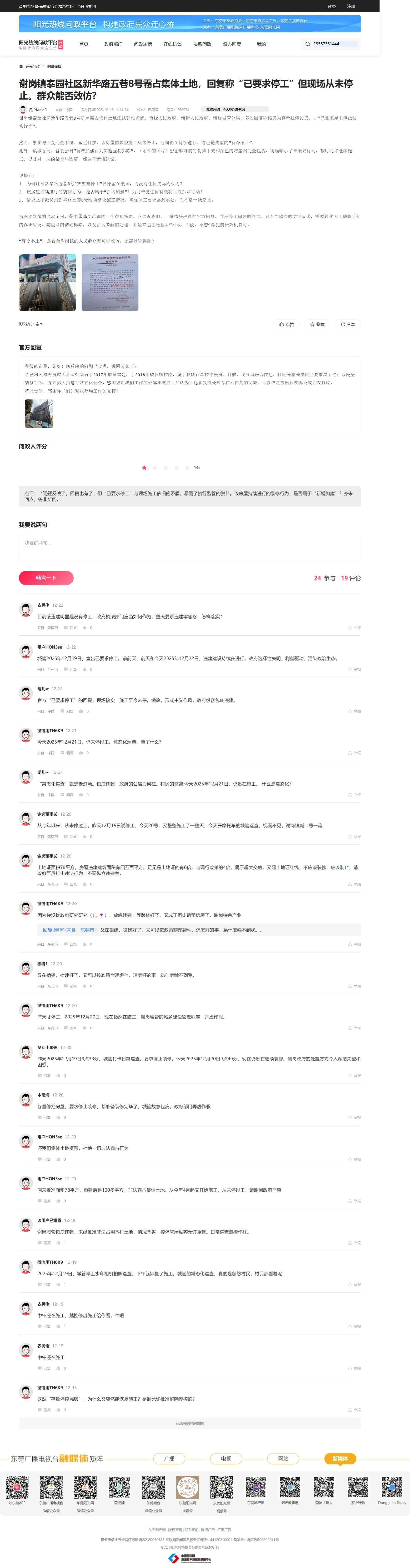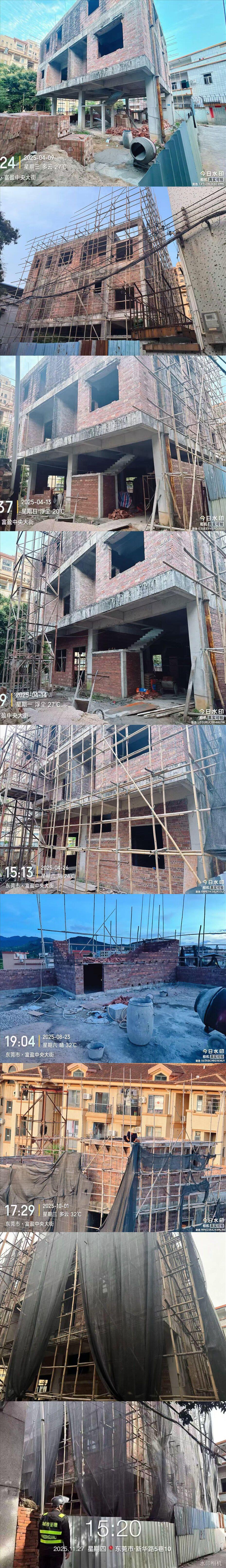 尊敬的谢岗镇人民政府: 现反映谢岗镇泰园社区新华路五巷8号房屋的违法建设问题。该房屋于2017年拆旧建新,因超面积等问题于2018年被控停,属于存量控停民房。 根据谢岗镇城管局于2025年7月10日出具的《处理意见书》,已明确要求屋主停止装修行为并组织调查。(但是现场图片2025年8月、10月仍然在施工。包括12月城管执法部门在巡查中,多次回复要求停工,由此证明房屋仍在是施工。) 然而,现场情况与官方要求严重不符。自2025年4月起,该房屋重新开始施工,主要工程包括对一层架空层进行围蔽,以及在顶楼新建楼梯间新建等(有2025年4月13日等日期拍摄的现场照片为证)。该行为发生在已被定性为“存量控停”且被明确要求停工之后。 现特此咨询,恳请明确回复以下问题: 1、性质认定:在已被“控停”的存量违法建筑上,于2025年4月开始的上述施工装修行为(一楼架空层围蔽和顶楼新建楼梯间新建),是否应当被认定为“新增违法建设”? 2、处理依据与措施:如果属于新增违建,根据《东莞市人民政府办公室关于印发〈东莞市违法用地、违法建设联合执法实施方案(修订)〉的通知》(东府办〔2020〕43号)的相关规定,谢岗镇相关执法部门应当采取何种具体的处理措施和执法步骤? 我们理解处理历史遗留问题需要过程,但坚决不容许在“控停”状态下公然进行新的建设,这既是对执法权威的挑战,也破坏了公平正义。请谢岗镇人民政府依据上述市政府文件的精神,严格落实“快速制止新增”的要求,对该处施工现场进行核实,并依法依规作出处理,以回应群众关切。 盼复。