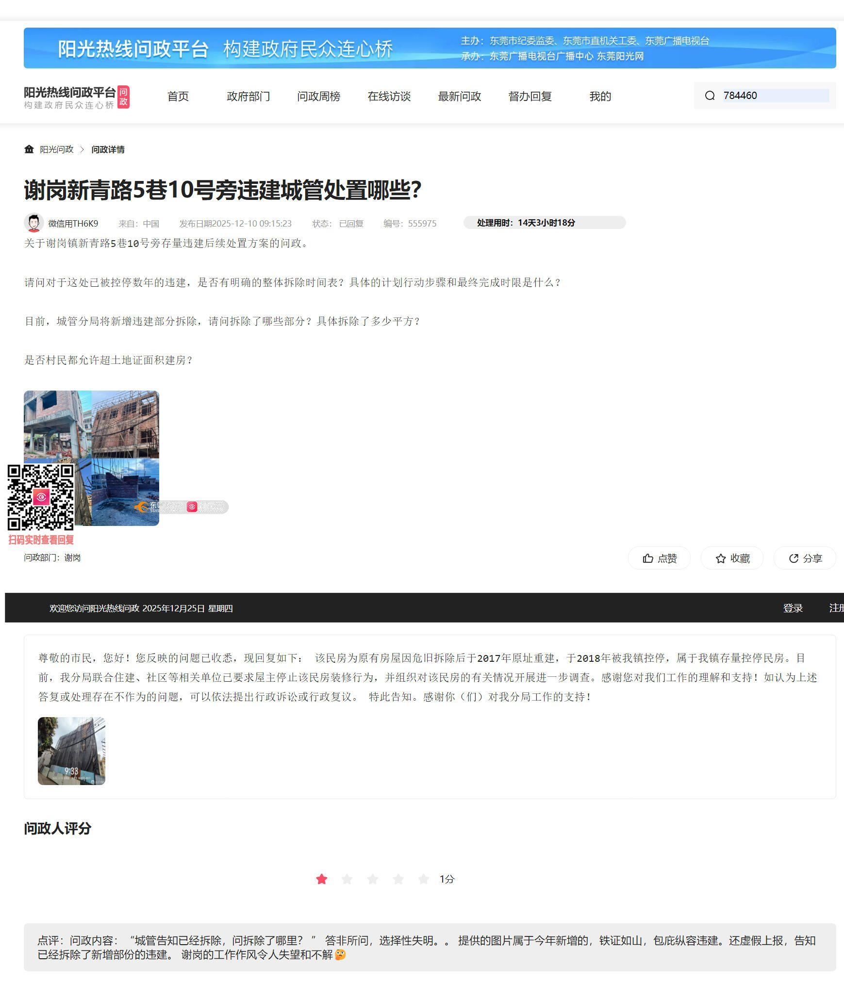 此前反映谢岗镇泰园社区新华路5巷10号旁(即8号)房屋的违建问题。根据此前官方在问政平台(如编号555975等)的公开回复,贵单位明确表示“期间发现的新增加建行为,我分局执法人员已对其实施强制拆除”。 该回复明确了“新增部分已拆除”这一事实,但未说明任何具体细节。为厘清事实,监督执法公开透明,现依据贵单位已公开的处置结论,特此追问以下具体问题,恳请逐一、明确、用事实和数据予以答复: 1、具体拆除部分:所谓“已强制拆除”的“新增加建行为”,具体是指该房屋的哪些构筑物或建筑部分?例如,是第几层的阳台、房间、墙体、棚架,或是其他什么具体构建? 2、具体拆除面积:上述被强制拆除的部分,具体的建筑面积或占地面积是多少平方米?请提供确切数据。 3、拆除后现状:该“新增部分”被拆除后,目前现场状态如何?是否已恢复至拆除前(或控停时)的原状?有无拆除后的现场照片可供查证? 希望本次问政能获得与“已实施强制拆除”这一结论相匹配的、清晰、具体的事实说明,而非笼统的重复性回复。请贵单位逐项回应,以事实和数据释疑。