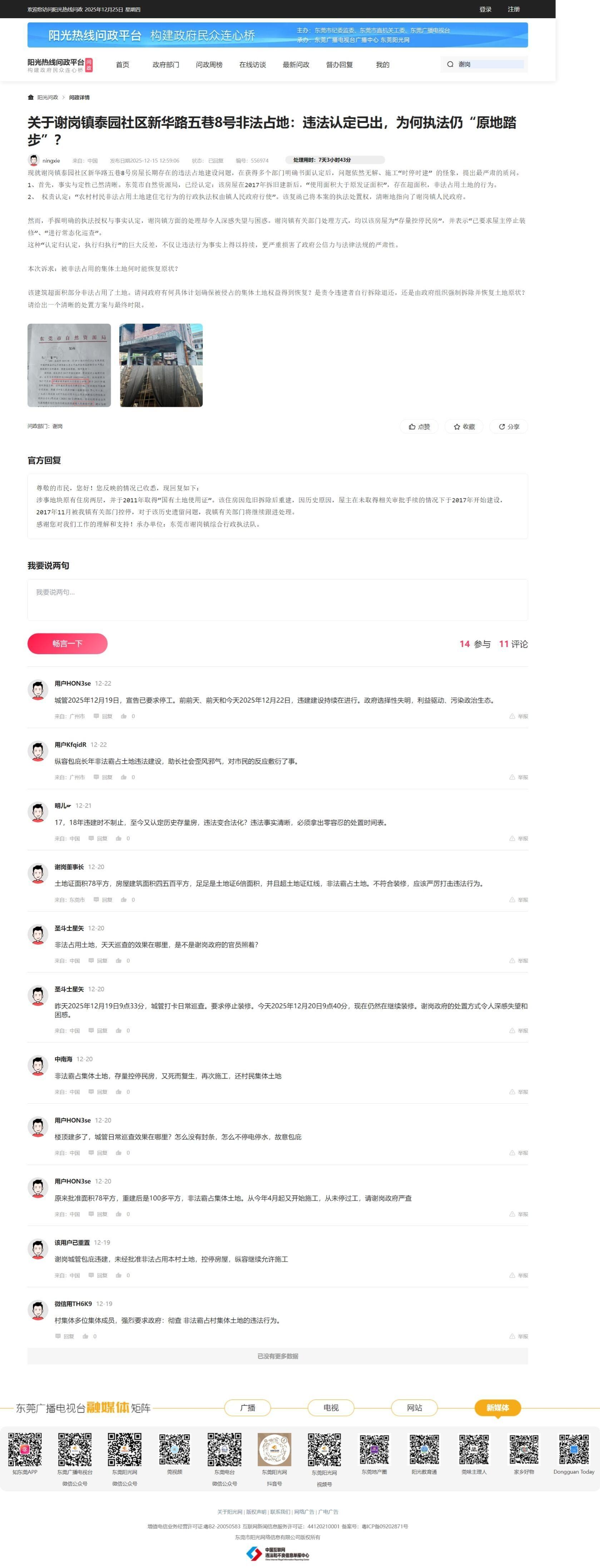 现就谢岗镇泰园社区新华路五巷8号房屋长期存在的非法占地建设问题,该违法行为自2017年发生并被“控停”至今,已长达八年。谢岗镇仅仅称其为“存量控停民房”,并称“组织进一步调查”。违法行为从主体建成到“时停时建”的装修状态持续存在。 在前期多次反映与相关部门已有明确认定后,执法工作却陷入“原地踏步”甚至“无限期调查”的怪象,现在提出问政。 一、 违法定性 1. 该行为属于“未经批准非法占用土地建住宅”。 2. 根据《土地管理法》第七十八条明确规定:“……责令退还非法占用的土地,限期拆除在非法占用的土地上新建的房屋。” 二、 核心矛盾与质疑(有法不依,执法不严,拖延推诿) 1. 法律适用问题: 《土地管理法》第七十八条 没有设置“历史存量”可免于处罚的例外条款,也未赋予执法机关“无限期调查”而暂不执行的法律空间。违法状态持续,法律义务就持续存在。 2. “存量控停”非“免罚金牌”: “控停”是发现违法后的临时措施,目的是制止继续违法,绝非对已建成违法建筑的“追认”或“合法化”处理。将“存量控停”作为拖延最终依法处置(拆除、退还土地)的理由,是对法律精神的曲解和行政职责的逃避。 3. 执法机制空转:市人民政府办公室已于2016年和2020年分别印发《东莞市违法用地、违法建设联合执法实施方案》(东府办(2016) 16号)和(东府办〔2020〕43号)。 要求对非法占地要求“快速拆除”。然而,在此事实清楚,谢岗执法,以“控停”代替已经执法,导致违法行为长期“晒太阳”。 三、本次问政诉求: 1、请问谢岗镇人民政府如何落实《土地管理法》第七十八条等规定? 2、请问政府有何具体计划确保被侵占的集体土地权益得到恢复?是责令违建者自行拆除退还,还是由政府组织强制拆除并恢复土地原状? 请不要再以“进一步调查”“存量处理”等理由敷衍回复。