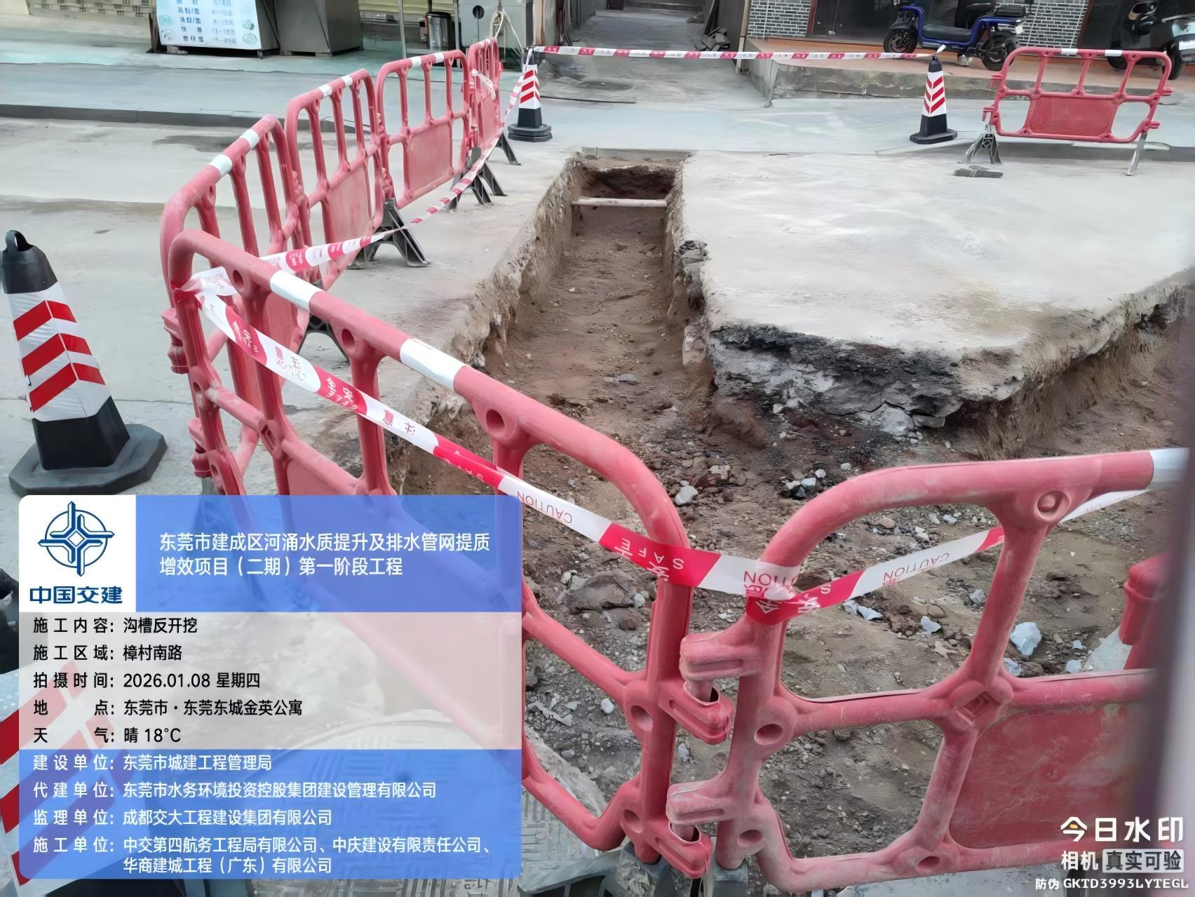 尊敬的市民,您好!您反映的问题已收悉,现回复如下: 收到反映的情况后,我们于2026年1月8日10:30对诉求进行办理,由于您的联系方式保密,我们未能与您取得联系。您反映问题的工程为东莞市水务环境投资控股集团建设管理有限公司(下称“建设公司”)负责代建管理的东莞市建成区河涌水质提升及排水管网提质增效项目(二期)第一阶段工程项目(东城街道),施工单位为中交第四航务工程局有限公司、华商建城工程广东有限公司、中庆建设有限责任公司公司。 关于您反映的施工问题,经核实,施工单位于2026年1月8号开始路面恢复作业,2026年1月13号已完成混凝土底基层和基层的恢复,预计2月初恢复路面沥青面层并恢复道路通行,施工期间给您造成不便及影响,敬请谅解。 如有疑问,欢迎致电水务环境集团24小时客服热线96968,感谢您对我们工作的理解和支持!