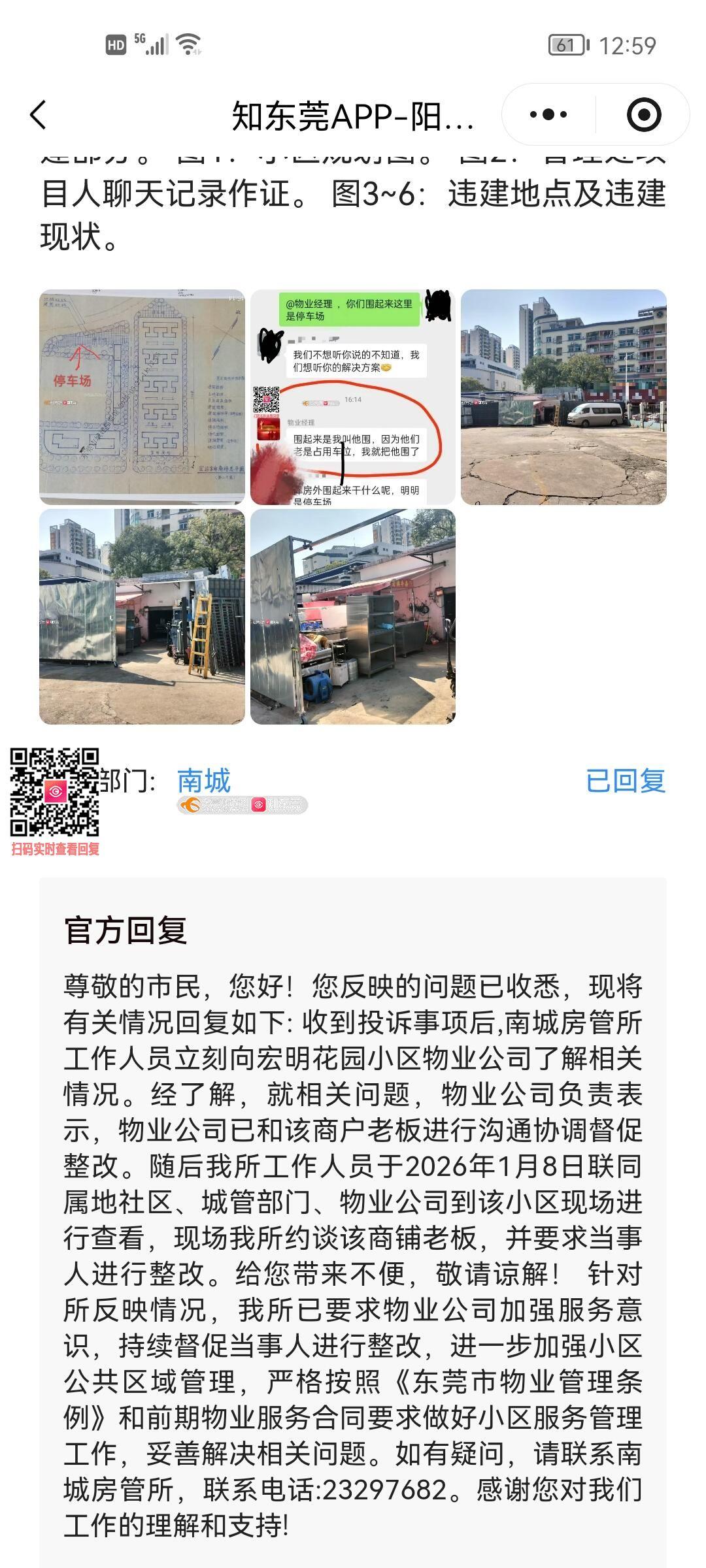 宏明花园小区物业管理处未按规划图操作私自将停车场违建成仓库,举报后也未见及时拆除。 图1规划图。 图2举报前实拍图。 图3举报后房管所回复。 图4~5房管所回复拍的现场图。 (合理合规维权,所有的图片带有水印)