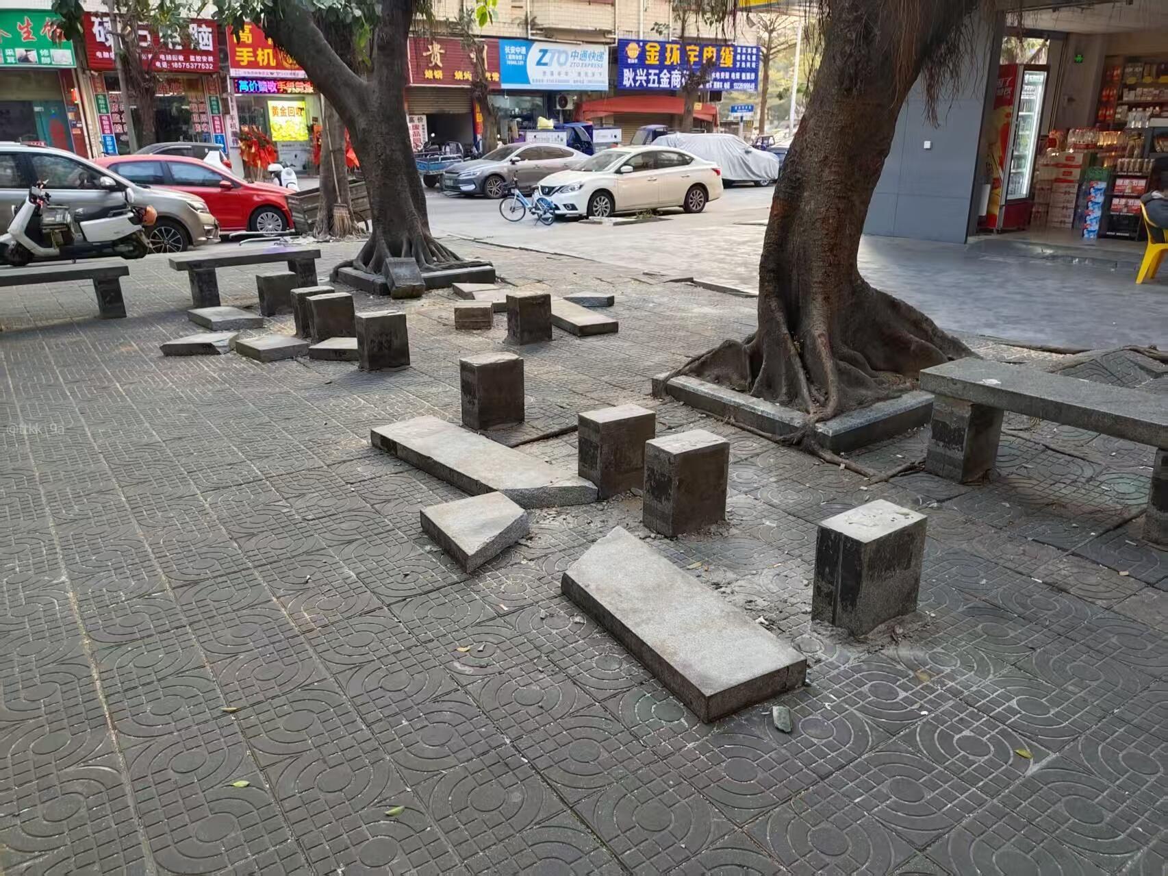 长安镇厦岗社区环球路4号瑞景苑 对面 供老人小孩休憩的石凳被破坏 有半个月了,一直没有修复。 请政府相关部门帮忙修复处理,这是附近居民唯一可以坐一坐,休息下的场所,谢谢。