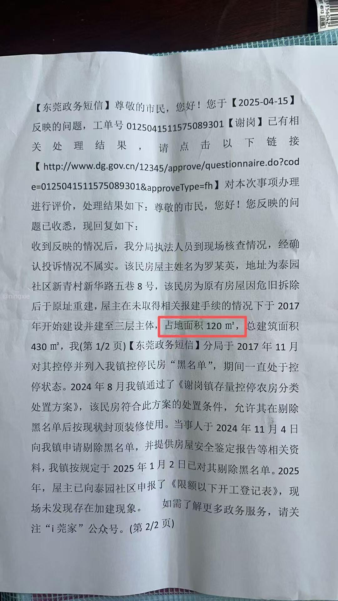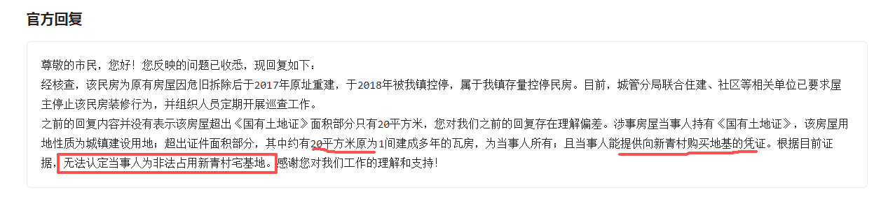 本人再次就新华路五巷8号房屋占地事宜提出疑问。谢岗镇人民政府此前回复称“无法认定当事人为非法占用新青村宅基地”,理由包括当事人“可提供向新青村购买地基的凭证”等。然而,该回复未提供任何实质性证据,也未能解释清楚关键事实,现特追问如下: 1、购买地基凭证中的具体面积是多少? 镇政府称当事人“可提供向新青村购买地基的凭证”,但未说明该凭证中记载的面积是否与现状占地120平方米一致。请公开该凭证中明确的购买面积,说明其与占地120平方米的关系。 2、超占41.3平方米土地的合法性依据是什么? 该房屋《国有土地证》权属面积为78.7平方米,现实际占地120平方米,超出41.3平方米。请说明超出部分土地是基于何种证据被认定为合法使用,而非非法占用宅基地,并请提供相关权属或批准文件依据。 3、为何不公开购买地基凭证供社会监督? 凭证是认定该地块权属的关键证据。为保障公众知情权与监督权,请按照政府信息公开原则,在脱敏处理后公开该凭证内容,包括交易双方、土地位置、面积、时间等,以接受群众核实。 4、20平方米瓦房的历史认定依据是什么? 回复中提到“有20平方米原为1间建成多年的瓦房”,请说明该瓦房的存在依据(如现场勘查记录、影像资料或证人证言等),并提供相关证据材料,说明其如何被认定为合法建筑并纳入现有占地面积。 综上,请贵单位逐项提供证据、文件编号或附图等实质性依据,避免仅以“历史遗留”等笼统表述回应。希望本次回复能真正澄清事实,回应公众质疑。
