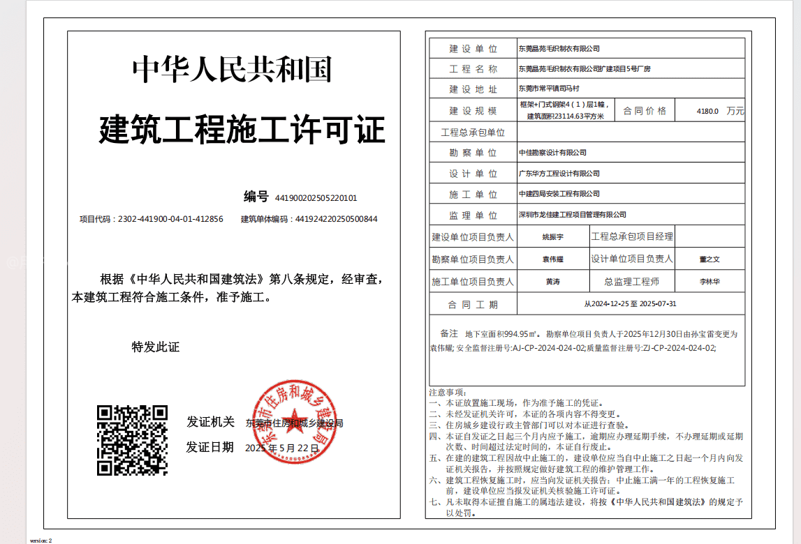 由东莞晶苑毛织制衣有限公司出资,中建四局安装工程有限公司进行施工的东莞晶苑毛织制衣有限公司扩建项目5 号厂房项目是否已经竣工验收,具体施工信息详见施工许可证