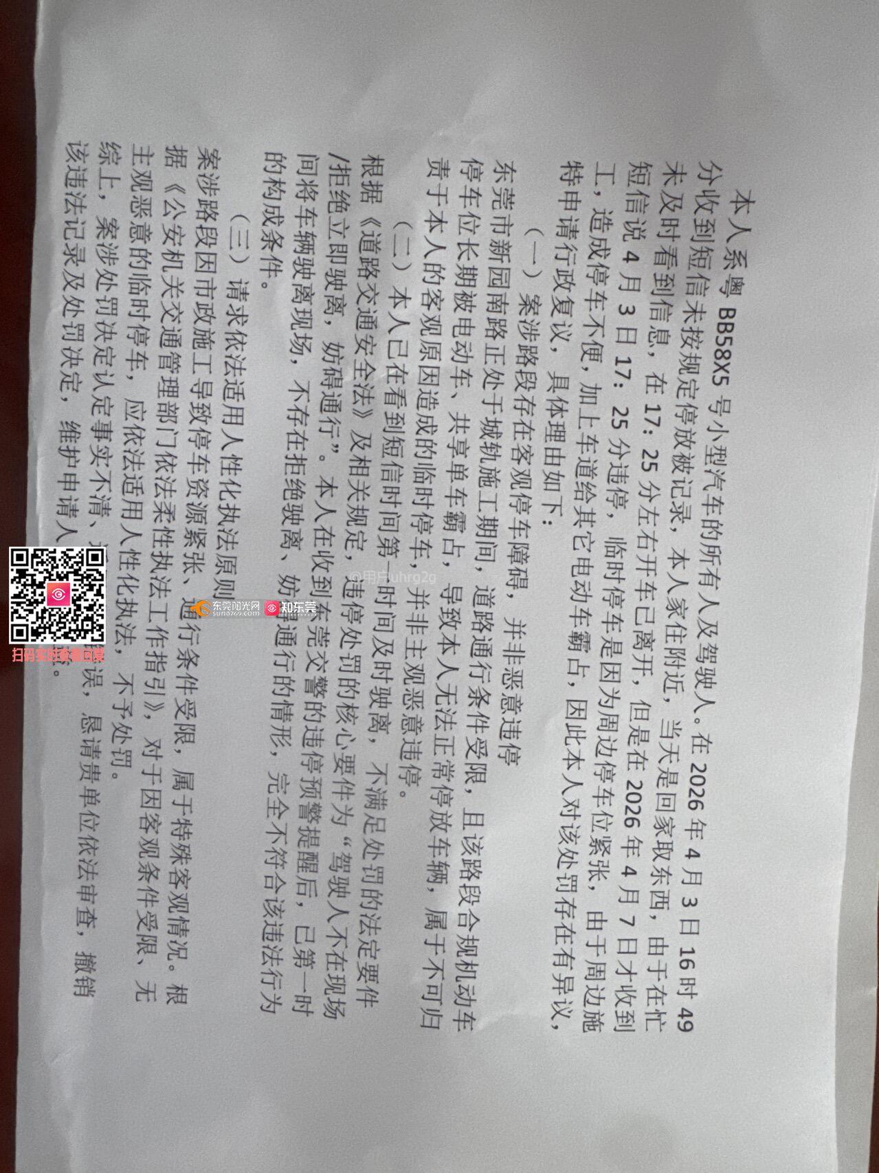 尊敬的交管部门: 本人车输于2026年04月03日在新园南路路段被记录违停,此前线上申诉被驳回,现补充说明:由于周边在施工🚧原本停车位较少,车位给机动车长期占用,没人管,当天本人临时停靠回家取东西,执法人员未有第一时间电话通知,提醒移车,在收到短信看了后第一时间己移车,短信时间16点49分,我在17点25分左右就移车了,并不是恶意停放,周边施工有一二年时间,一直都有人这样停,就只有4月3日当天有交警出现抄牌,本人怀疑是否交通部门当天有未完成的指标才有这个罚单,为什么一直施工,未标明确禁停,没有明确指引,直到现在又在搞围村收费才来动抄牌。周边车位紧张,造成在地居住人员不便,车位给占用也没有人管,请相关部门依法撤销不当处罚。本人愿意配合提供全部证据。谢谢。