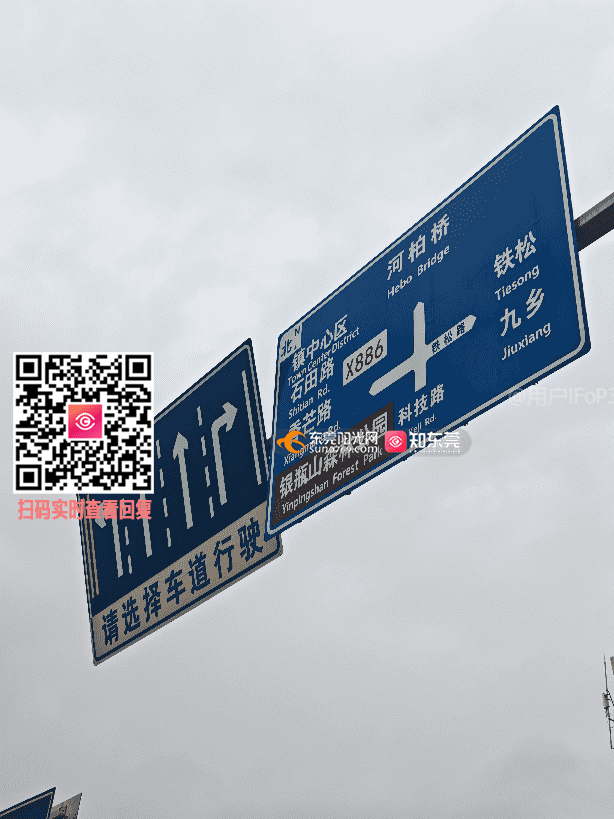 清溪科技路南向北方向,距离与铁松路交界处红绿灯50m位置 请选择车道行驶道路指示牌歪斜,从后端能看到缝隙 烦请检查