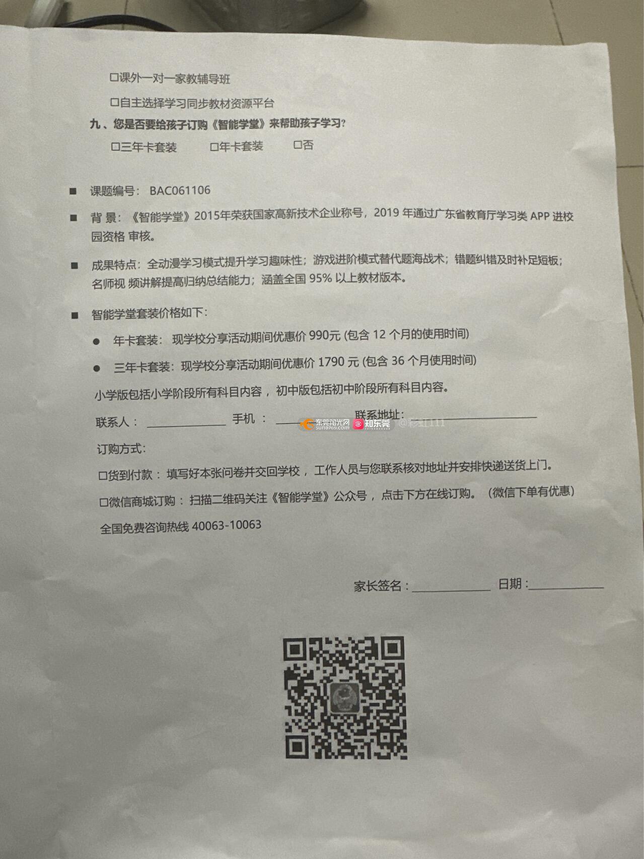 初中新生刚开学第一周就带回来【智能学堂】的调查问卷让家长签名订购990元一年的网课平台,虽然是自愿,那既然进了校园,如果我们不订,其他学生都订了,我又怕孩子错过了一个学习的机会,跟不上学习。但要订这个学习平台,又不知道是不是学校或者是教育部门统一要求的?学校刚开学就宣传这个学习平台,那学生还去学校上学做什么,直接都在家看视频学习就得了,希望相关部门能调查重视一下这种不正之风!!!