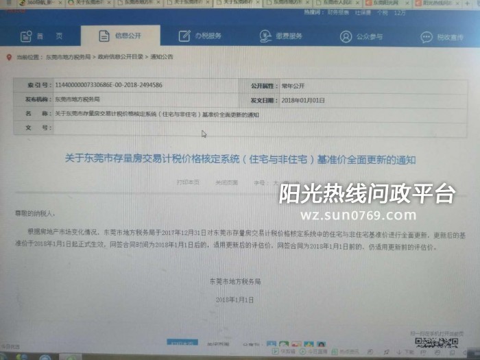 我局于2018年1月18日收到阳光热线网络问政平台转来编号为176666的来信,已于1月18日转我局纳税服务科办理,现就相关问题简要回复如下: 根据《关于启用东莞市存量房交易计税价格评估系统的公告》(东府〔2012〕40号)的规定,从2012年3月31日起,在东莞市范围内正式启用东莞市存量房交易计税价格评估系统。评估系统产生的评估价格涵盖了楼幢基准价、朝向、楼层、面积等多重因素,并根据相关规定以及房地产市场变化情况,本市存量房交易计税价格核定系统基准价数据会相应进行动态更新。本次调整的适用范围以网签合同号为准,即网签合同时间为2018年1月1日后的,适用更新后的评估价,网签合同为2018年1月1日前的,仍适用更新前的评估价。 因存量房的交易业务纳税申报是需要根据实际情况进行的,为此,有关税费应以来信人提供的具体办税资料并经当地税务部门核实后计算为准。在受理过程中,如纳税人认为交易价格低于评估结果的,可通过争议处理及个案评估流程向征收分局申请计税价格重评。 我们将把您所反映的有关优化评估系统的意见和建议反馈到我局相关部门。 如仍有其他疑问,欢迎致电地税纳税服务热线12366-2-2-0-1(拨通12366,根据语音提示按2转入地税,再按2转入其他税费咨询,按0转入人工服务后按1可以接入东莞话务坐席)咨询。