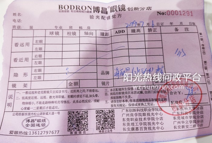 关于对阳光热线224889号的回复 阳光热线栏目组: 贵单位转来受理号为224889的信件收悉,现回复如下: 经检查,轻工业学院对面的博昌眼镜有营业执照,名称为东莞市厚街镜匠视光眼镜店;创新学校学生宿舍7栋一楼的博昌眼镜尚未办照,两家店均为同一当事人,执法人员已责令其尽快办照。当事人提供了被投诉的产品的检验报告,不存在质量不合格的情况。已告知举报人检查情况,举报人无异议。 此复 东莞市市场监督管理局 2019年9月6日