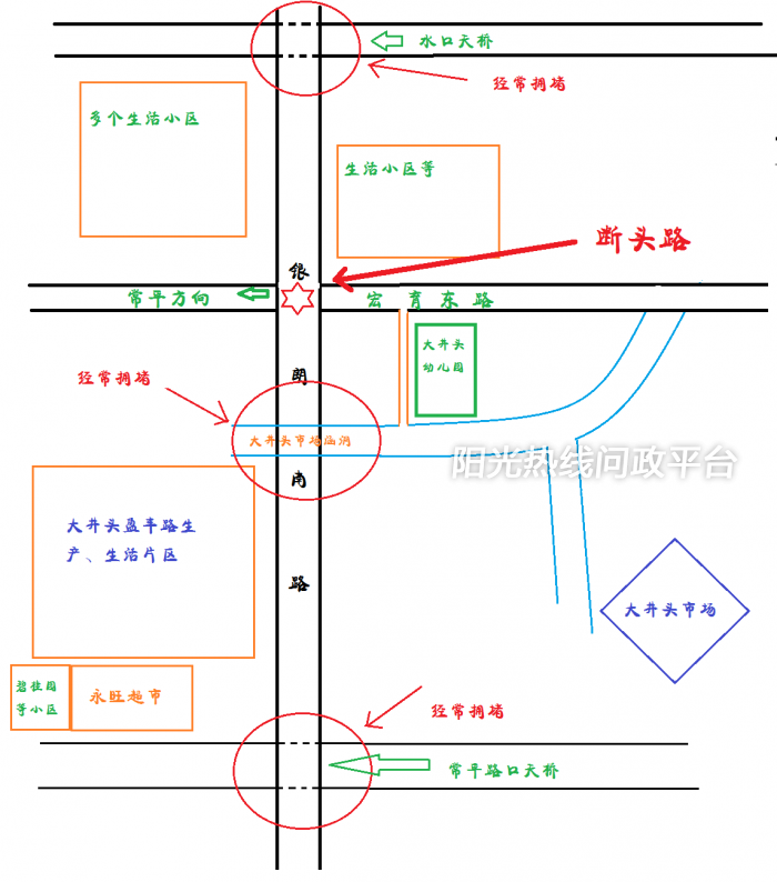 这次问政是反馈关于大井头幼儿园每天上孩上学放学期间拥堵无法通行,并且严重影响家长小孩安全的情况。 我是一位外地在大朗生活并自有公司的企业主,每年多少也为大朗缴了几十万的税,居住于大井头盈丰路附近,小孩在大井头幼儿园读书,每天上学放学都因为拥堵苦不堪言,经过我仔细观察,大井头幼儿园位于银朗南路大井头市场涵洞口位置,以银朗南路为切点大朗方向有大井头菜市场和大片居民区及宏育东路主干道,常平方向为大井头盈丰路居民和生产生活工业区,往深圳方向大概3KM为水口天桥,向东莞方向大概3KM为常朗路天桥,由于宏育东路向常平方向主干道在银朗路全封闭, 大朗、常平、深圳、东莞方向车辆无法直接通行或者都调头及转弯,需在水口天桥或者常朗路天桥调头,形成经常车流量多,拥堵情况比较多,尤其是上下班高峰期特别严重,因此也导致许多车辆迫不得已在大井头涵洞通行,再加上周边的生产、生活和菜市场的车流,导致大井头市场涵洞极易拥堵,事故频发,由于大井头幼儿园紧靠大井头市场涵洞更是让学生家长和孩子苦不堪言,在此特别做了一个平面图做为参考,希望大朗交通部门本着以人为本,以祖国花朵的安全着想,开通宏育东路到常平方向银朗路的红绿灯,打通断头路,分流大井头市场涵洞的车流,给孩子们和来往车辆一个畅通的道路和安全的通行。谢谢