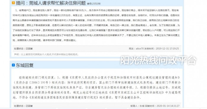 关于编号:235198的回复: 1、《东城街道住房困难居民安居保障房建设暂行规定》明确载明“申请人每户只有唯一住房(唯一住房是指只拥有一套房屋产权或房屋使用权),房屋、宅基地权属明确,不存在争议且人均居住建筑面积低于35平方米。若户口簿中成员已婚且其配偶未迁移户口的,除需核对户口簿中成员的房产情况外,还需核对配偶房产情况并纳入人均居住建筑面积计算范围”。我家的情况完全符合上述情况,且宅基地权属明确,有发票、《国土证》予以证明,2019年年头申请报建,因为不属于东城户籍的居民不能审批,严重侵犯宅基地业主的权益。如果你们所称《东莞市人民政府办公室关于规范和加强我市村居民公寓规划建设管理的通知》(东府办函〔2006〕195号)相关内容:除市政府同意的项目,国土部门不再审批新建独院式私房用地,建设部门不再新办独院私房报建,房管部门不再核发独院私房房产证。那么《东城街道住房困难居民安居保障房建设暂行规定》又算什么规定,审不审批全部你们政府说了算,本来《东城街道住房困难居民安居保障房建设暂行规定》出台本质解决闲置土地和保障本地困难居民的居住问题,现在楼价如何高企,根本不够资金购买符合一家6口人居住的房子,只能租住,各种条件也不符合廉租房的规定,如果解决我们本地人的住房问题,而且宅基地的权属非常明确,是属于我们的,《国土证》明确载明家属名字。外来人就拥有住房补贴,住房购房优惠,本地人民生问题完全没有解决,多少本地人没有房子居住??? 2、我方提供的土地证号明确载明“住宅性质”而且有《国土证》也载明住宅性质,东莞市自然资源局于2019年也出具相关查询资料是"住宅性质”相关东城规划管理与我现场查看,并查看了《国土证》和《东莞市自然资源局出具查询资料》均显示“住宅性质”。为什么现场回复,市局查询、分局查询结果不一致?是否存在霸占居民合法用地或者私自修改土地性质的情况。关于“住宅用地”国土局、自然资源局、规划局均当面核对信息,查询信息,明确告知是“住宅性质”,为什么每次当面回复是“住宅性质”,网络咨询如何解决问题就说“道路用地”是否因为不想让我们有住房居住,而故意推搪。
