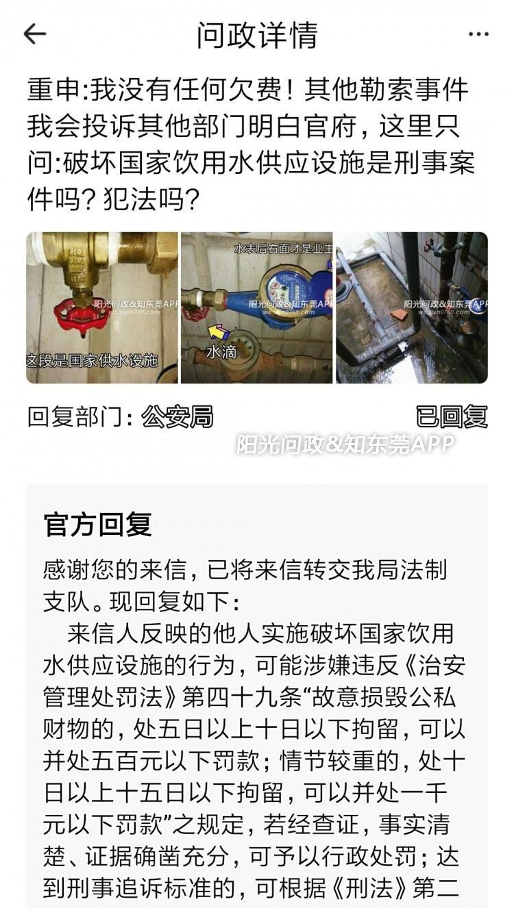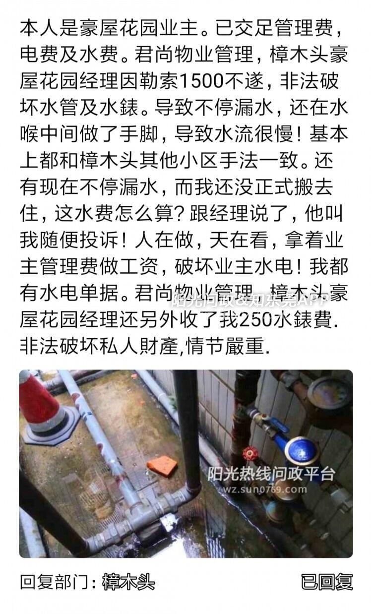 阳光热线栏目组: 贵组转来“意见与回音”编号为251538号信件已收悉,我办立即与房管所联系处理,该信件回复如下: 根据信访人的反映,我镇相关部门到现场调查,没有信访人描述的破坏F座502单元水电的情况,信访人可以在回来时到豪屋花园当面调解。 东莞市尚君物业管理有限公司于2013年成立,在政府部门备案登记,同属服务的花园有樟木头雅翠花园、龙图花园等,信访人缴交的管理费有效,出纳员刘女士在豪屋花园管理处服务二十多年,如有任何疑问可以直接到管理处咨询。 樟木头镇 2020年7月24日
