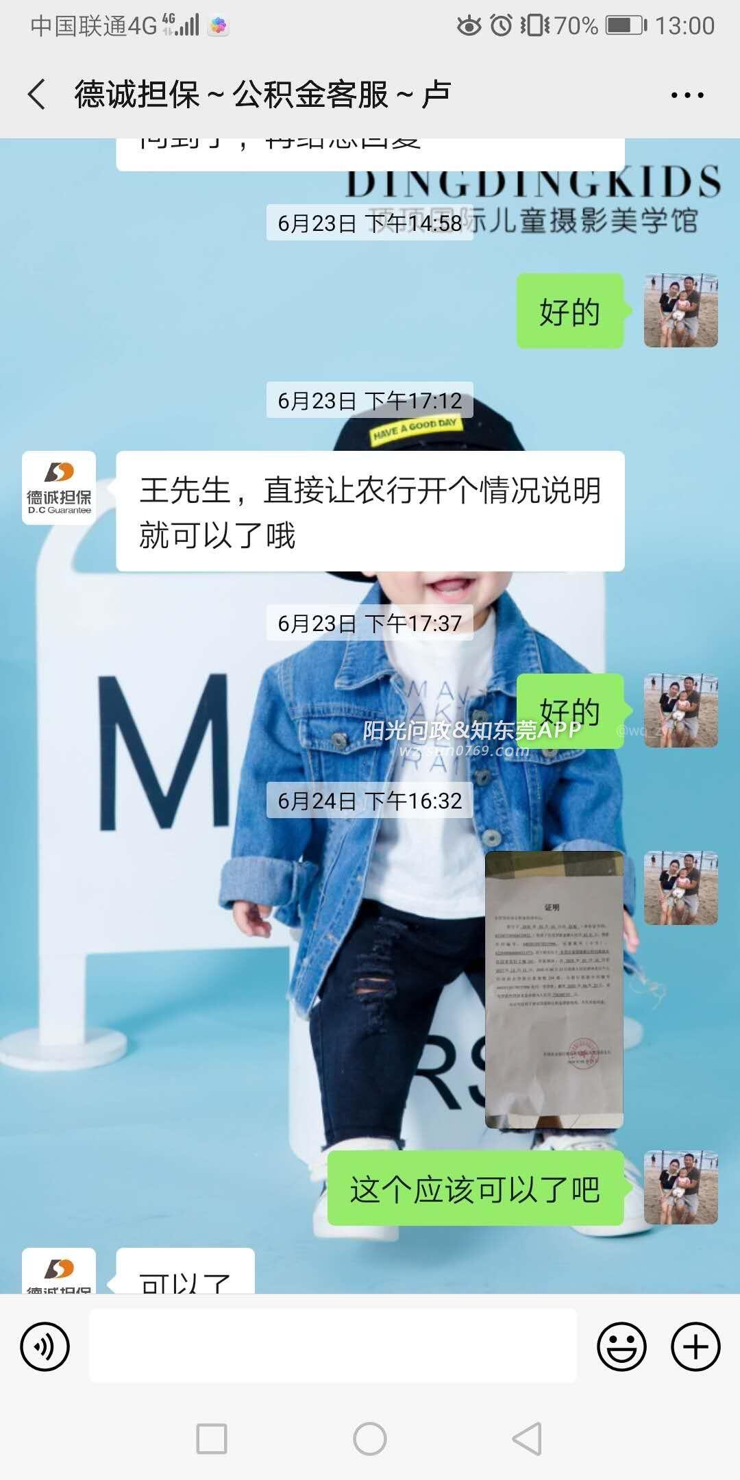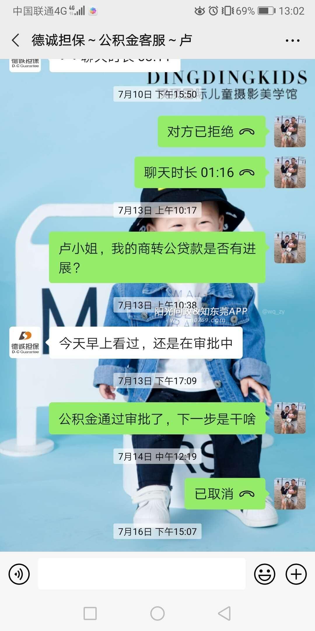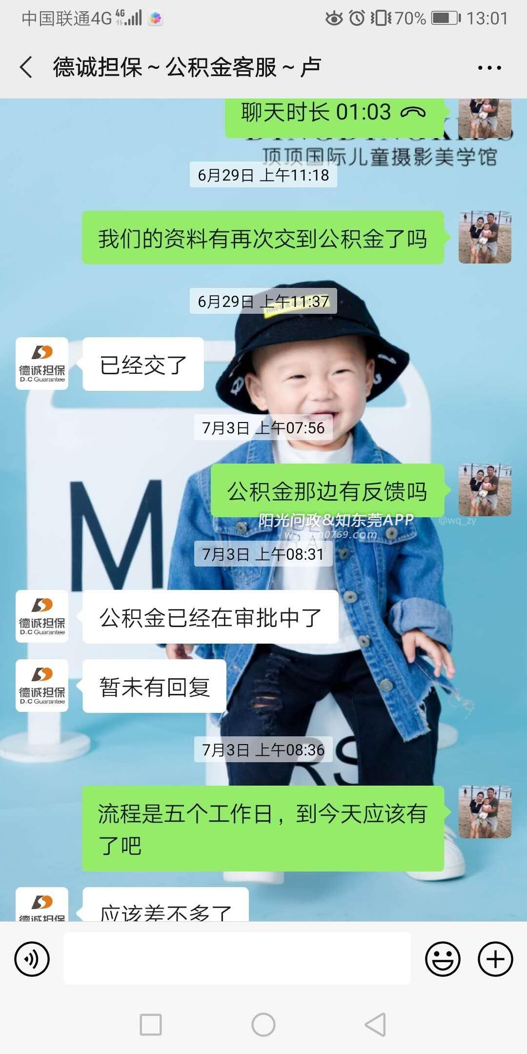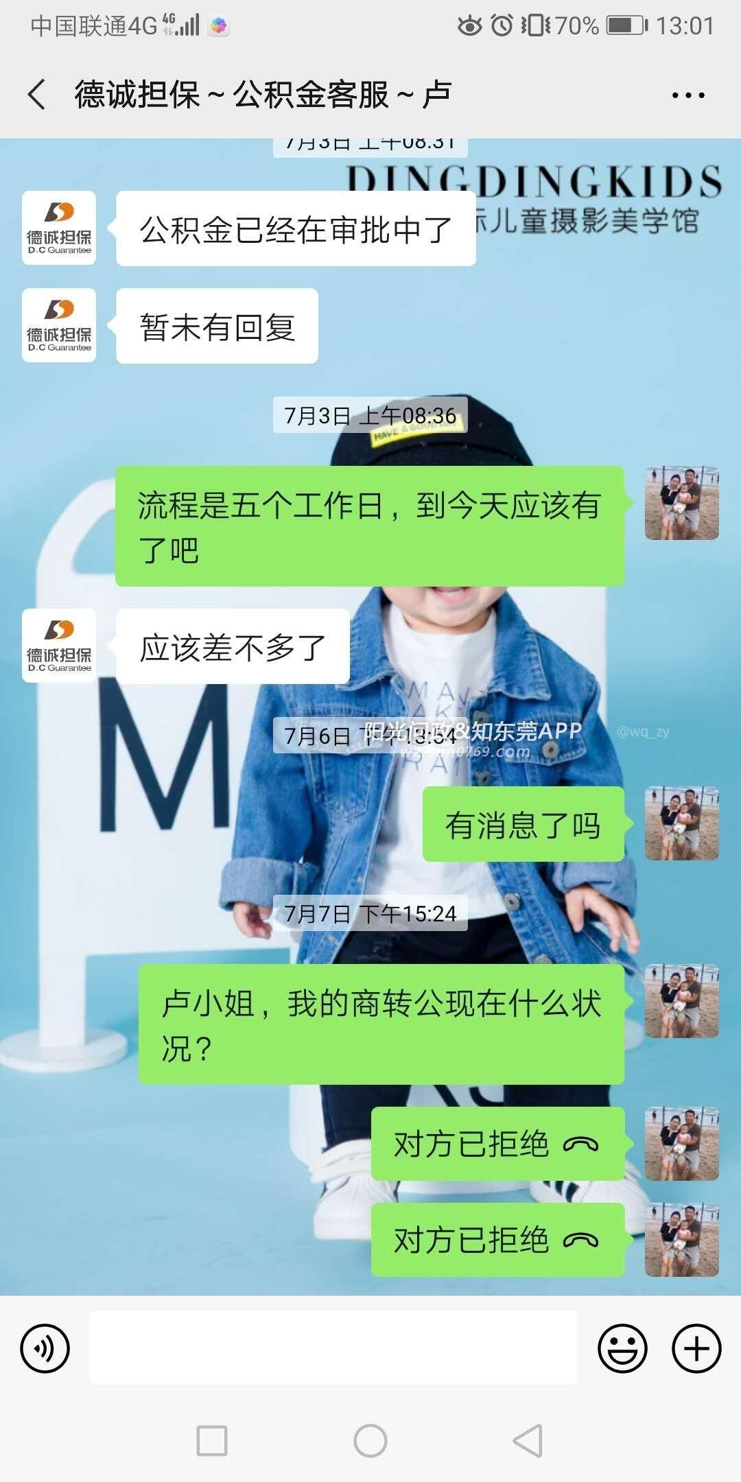 尊敬的公积金中心领导: 感谢您在百忙之中倾听我在办理商转公中的种种不快,“房事”无小,且听我细细道来: 考虑到公积金贷款比商贷所还房贷少,能减轻些家庭负担,我通过东莞公积金官网选择了东莞市德诚融资担保有限公司(以下简称德诚担保)来办理商转公业务。在办理之前,我详细了解了办理该项业务所需的材料和办理流程,并提前一个星期进行了准备。于今年6月9号到德诚担保提交所有资料,并在当天陪德诚担保工作人员去公证处办理公证书,全权委托德诚担保办理商转公事宜。 德诚担保于6月10号第一次提交到公积金管理中心申办。大约在6月18号被告知征信里的房贷期数与农行(商贷银行)所出具的期数不同。我联系农行并于6月24号出具了证明。 6月28号第二次提交到公积金管理中心。在等待过程中,7月3号致电询问进度事宜,在此前我了解到的流程是公积金中心办理时限是5个工作日。至7月3号刚好有5个工作日。但是德诚担保连续多日未予答复,多次不接电话,直至7月7号回复还在受理中。到7月9号期间,十分焦急的我多次致电德诚担保,才得知由于他们工作失误将公积金明细多上传了一份,导致被退回,但是此过程中我一无所知。 事后得知原来在7月7号左右,德诚担保因工作失误,第三次提交到公积金管理中心申办。终于在7月13号,公积金管理中心审核通过。之后我向德诚担保支付了担保费+服务费。 于7月16号,被德诚担保告知需要去农行办理商贷偿还,由于房子是在我太太的名下,我无法办法,要么是本人来办理或者我有公证书代办,办理失败。7月24号,我太太本人和德诚担保去农行办理了偿还手续。7月28号被德诚担保告知还需要本人去农行办理解押手续,在此过程中得知德诚担保还未取得公证处出具的公证书,所以需要本人去。在办理商转公之前德诚担保告诉我除办公证书外,其他流程不需要我跑腿,他们可以全部代办。至此不经要问,过去这么久了德诚担保居然还没有公证书,那么它是怎么能代表我去办理这些手续的?原本这些德诚担保都可以去代办的,服务费何在?这个过程中出了什么问题?我一无所知。 此事不为哗众取宠,如果担保机构从中有不法行为而不为人知,如何保护被担保人的合法权益?当然这只是架设,只盼这些盈利性机构能提升服务质量和透明,并且坦诚与客户沟通,公积中心能给监督这些机构,让大家放心。