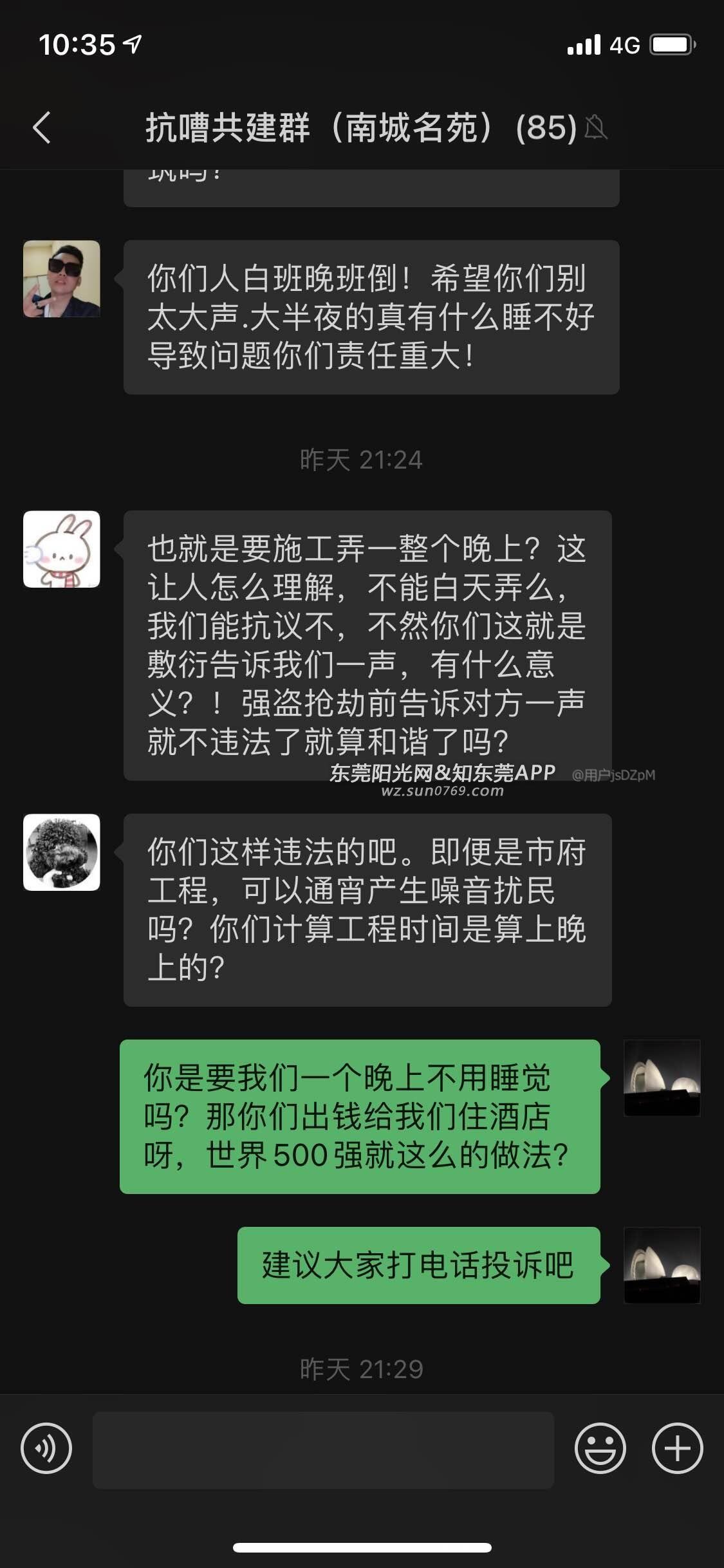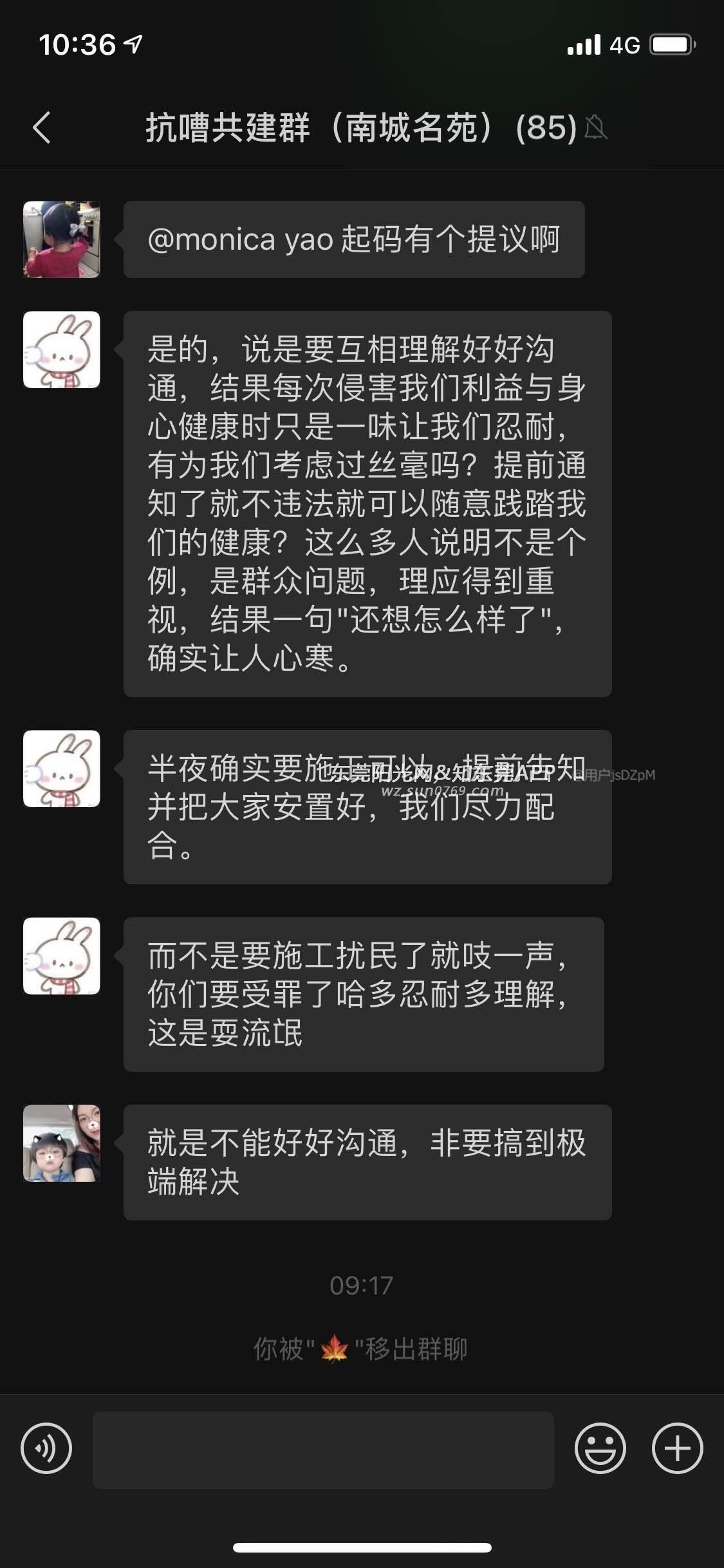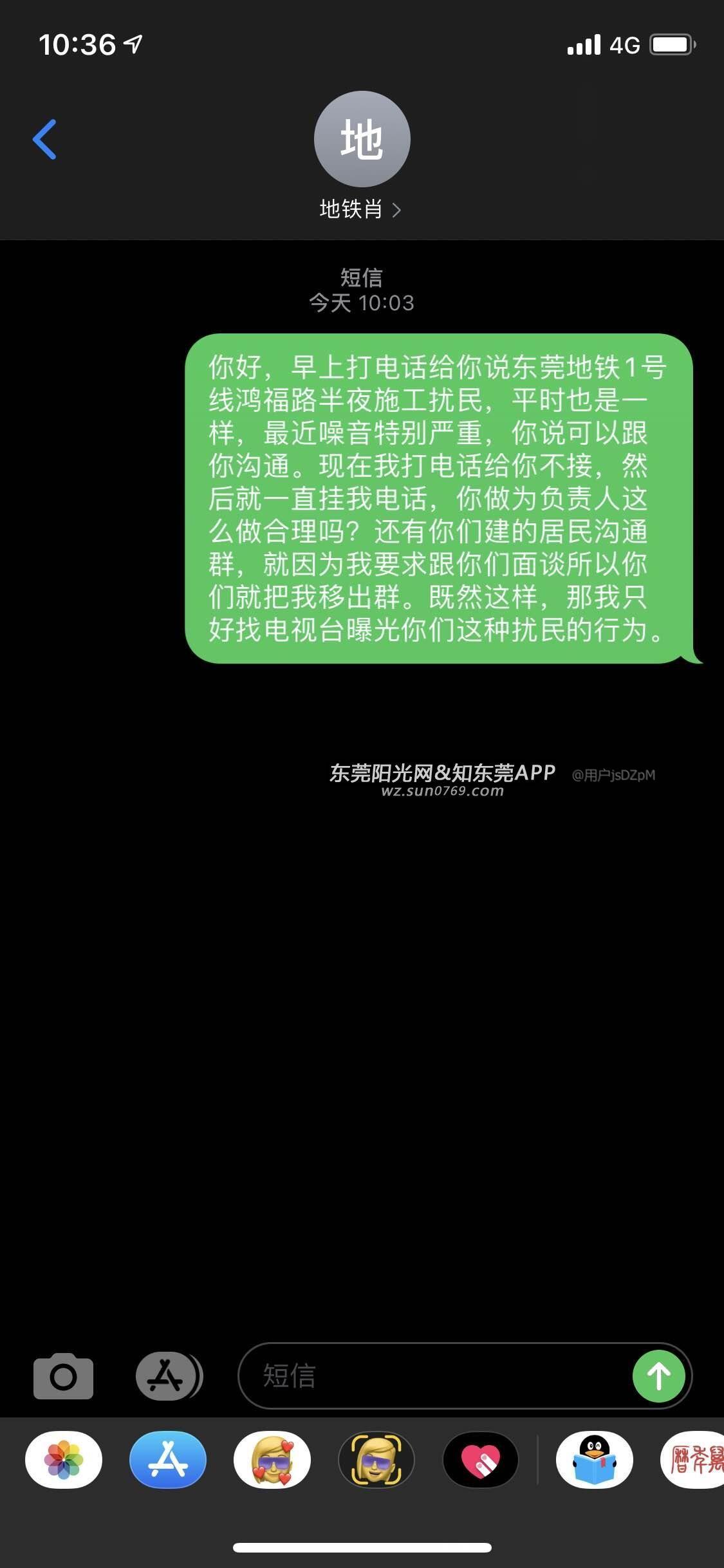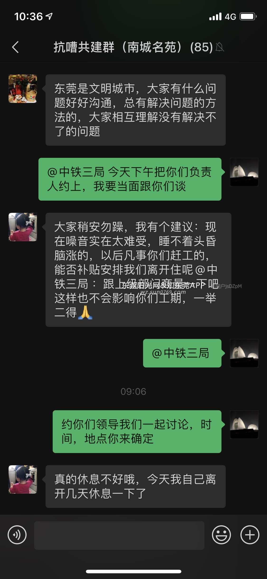 各位领导,地铁1号线鸿福路段(南城商务大厦旁)每天晚上很晚停工,搞的周围居民无法入睡。昨夜11月18日告知需要通宵作业,周围的居民都反对,可是施工单位中国中铁不理我们的信息,也不管我们是否被吵到一直施工到早上。给施工方负责人肖先生打电话刚开始说会注意,后来我们要求与施工方碰面协商噪音事宜,他们就不出声了,还把相关邻居T出沟通群,这完全是霸王行为,一点都不对周围的居民负责,强烈要求相关部门对此行为进行调查并给我们这些受到伤害的老百姓一个说法。