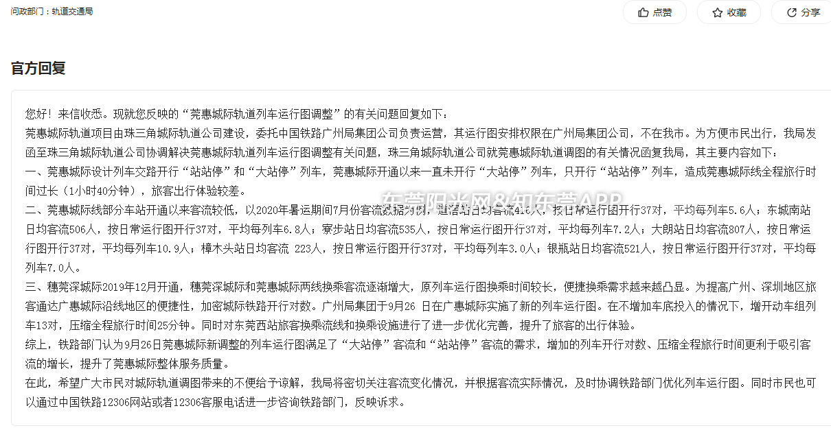 在东莞市境内减少了6个站点的班次的情况下,轨道交通部门能代市民发声,致函珠三角城际轨道公司询问更改原因,现仍有事项不明,但今日惊闻莞惠轻轨再次调整,一查班次,又停了一半,往返常平南与谢岗银瓶站之间一天来回只剩下4趟车了,不知道今日下班后怎么回家,万分无奈,请代为解惑: 1、既然珠三角城际轨道公司回函称,“莞惠城际设计列车交路开行‘站站停’和‘大站停’列车,莞惠城际开通以来一直未开行‘大站停’列车,只开行‘站站停’列车”,那为什么更改运行图后只剩下“大站停”,不见“站站停”。是否现有的轻轨设计不能同时开通“站站停”和“大站停”两种运行模式,如不能,是否在设计站点时没有考虑超车换车问题,如此,是否为设计缺陷?如果能,能否迁就照顾一下通勤的人员,起码在下班时间段更改一两辆“站站停”。 2、现在新的运行图每趟列车比原来提前25分钟,以每个站点停靠3分为均值,则3*8=24分钟,故有理由怀疑铁道部门是靠砍掉8个站点的停靠时间换来的,列车是否真的提速了,提速了多少?莞惠轻轨的设计车速、实际车速现在是多少,还有没有提速缩短运行的空间? 3、回函称,以7月份东莞市的客流量为例子,道滘日均客流416人,东城南站日均客流506人,寮步站(535人),大朗站(807人),樟木头站(223人) ,银瓶站(521人),则共计416+506+535+807+223+521=3008人,即受影响最大可能多至3000人,即使这三千人都是来回在这随机6个站中的两个站,也有至少1500人是乘坐轻轨经过这些小站的。注意,7月份的客流量是没有多少学生数据影响的,也就是实实在在通勤受影响的人。假如这1500人中间,再有一半人在轻轨交通满足不了的情况下,改为私家车通勤,那也至少是700辆私家车,难道非得要迫使在轻轨横跨的这6个镇,再投入这么多私家车上路吗?想想涌莞高速,想想环城快速路。。。内心实在拒绝开车。。。 再有,莞惠轻轨通过提速去争取跨城市出行的客源,这无可厚非,但是在横跨那么多镇街的市民只能被舍弃而眼睁睁看着吗?跨市、市中心互通的交通本来就很多,现在连一滴的溢出效应都不给,这是否有违当初建设莞惠轻轨的初衷。既然铁路部门一直声称轻轨亏损严重,为什么还要舍弃一大部分客源,对比城镇间的客运汽车拉客源的方式,这种运营方式是否值得商榷。 4、深莞惠在谋划1小时通勤都市圈,敢问是否是这种原因? 5、之前也有人建议莞惠轻轨地铁化运营,敢问是否有类似规划或者打算,如果地铁化,是否又要更改车站和车轨设计?因现在莞惠轻轨穿至少6个镇区,目前等市地铁规划建成还远未可期,在凤岗镇被纳入深圳地铁网之后,中北部、和东部山区是否也可以奢望一下,能有一个便利的城轨穿行。 6、实在不好意思再次打扰市轨道交通局,因向12306反映基本都石沉大海