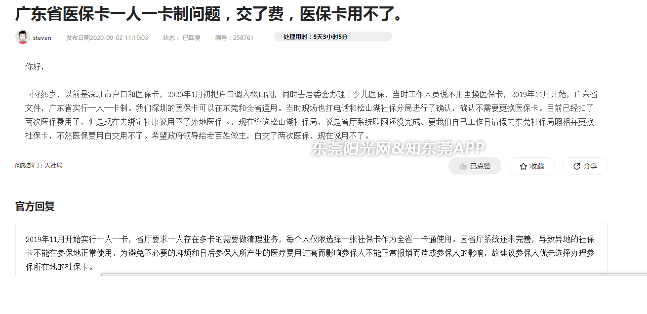 小孩5岁,以前是深圳市户口和医保卡,2020年1月初把户口调入松山湖,同时去管委会办理了少儿医保,当时工作人员强调说不用更换医保卡,2019年11月开始,广东省文件,广东省实行一人一卡制。我们深圳的医保卡可以在东莞和全省通用。当时现场也打电话和社保局进行了确认,确认不需要更换医保卡。目前已经扣了两次医保费用了,但是现在去绑定社康说用不了外地医保卡,现在咨询松山湖社保局,说是省厅系统联网还没完成。要我们自己工作日请假去东莞社保局照相并更换社保卡,不然医保费用白交用不了。希望政府相关部门能帮忙解决处理,并退回已扣的费用。 附件是多次投诉,政府不作为的回复截图。