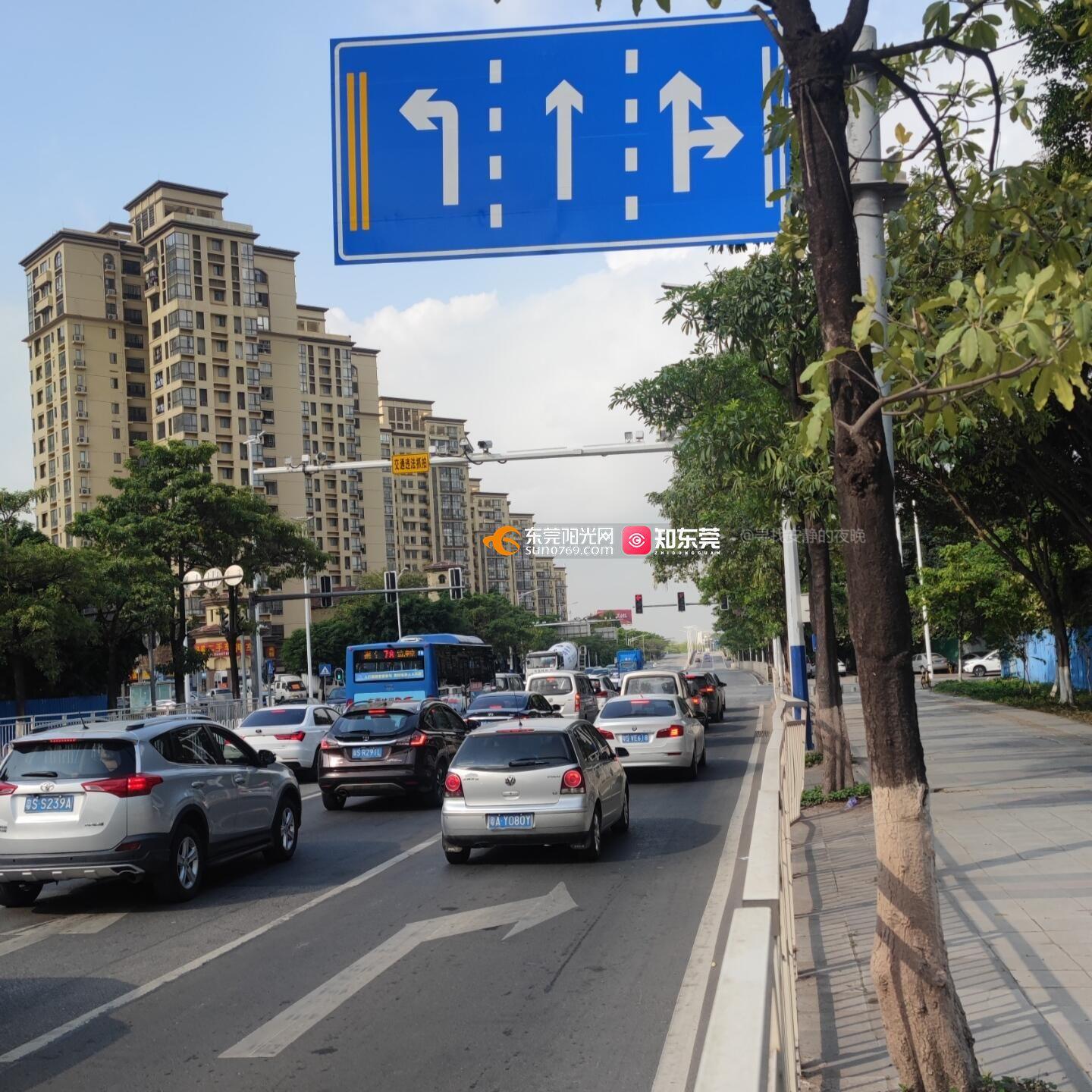 港口大道万江往沙田方向,港口大道与和谐路红绿灯路口,路面导向箭头与标牌导向标志不符,引起直行一条车道排起长龙。导向标示牌直行车道加右转弯加车道