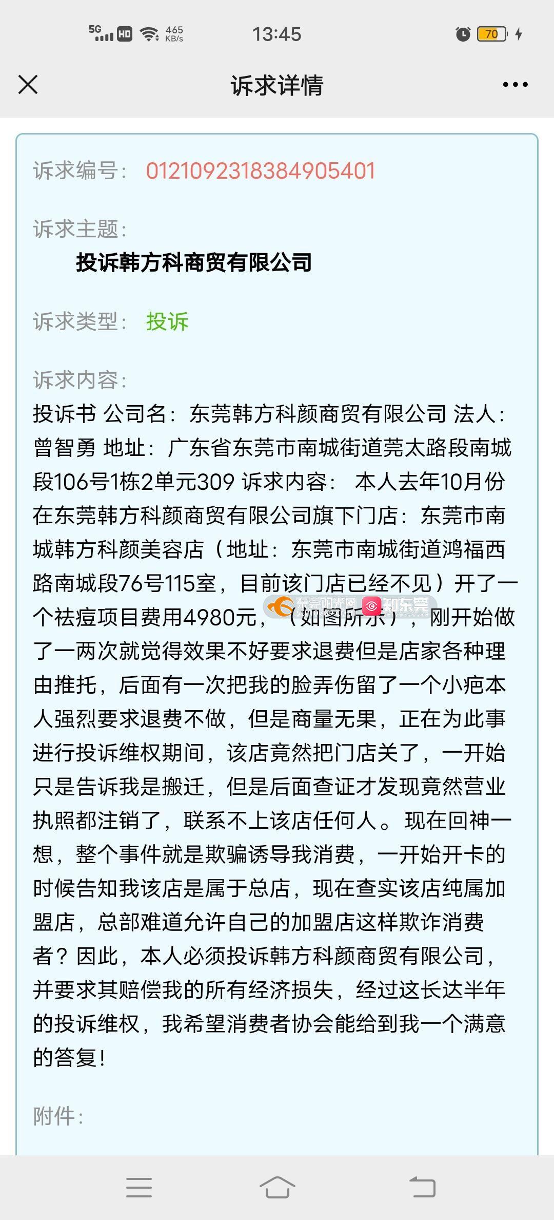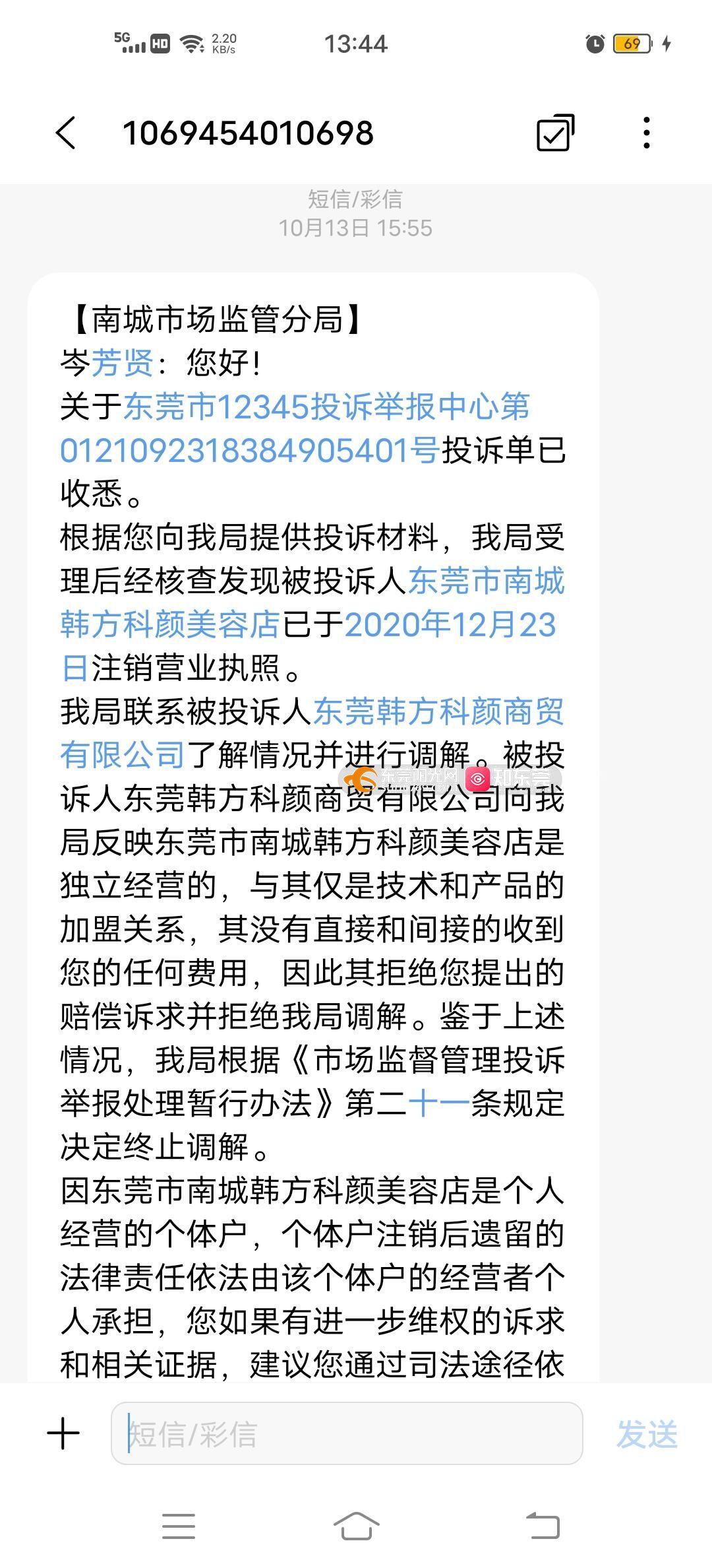 关于对阳光热线306283号的回复 阳光热线栏目组: 贵单位转来受理号为306283的信件收悉,现回复如下: 一、举报人消费纠纷第一次投诉的处理情况 2021年5月10日,我局首次接到岑小姐反映在宋建海经营的南城韩方科颜美容店支付4980元办理祛痘年卡,治疗效果差,挤完痘后留疤。岑小姐要求退费,但商家告知退费要按单次计算费用,该店业务已迁移到南城西平店,让其去西平店继续做祛痘。岑小姐认为不合理而要求商家退费。收到该《投诉单》后,我局工作人员核查发现,被投诉人“东莞市南城韩方科颜美容店”已于2020年12月23日注销,该美容店的经营负责人宋建海仅有的另一家美容店“东莞市东城呼颜本色美容店”,地址在东城街道东骏路东城段2号179室、180室,由于该美容店不属我局管辖,经查询未发现宋建海在南城街道未有所谓的“西平店”,我分局依据《市场监督管理投诉举报处理暂行办法》第十五条第(一)项和第二十一条第(六)项规定决定终止调解,建议投诉人向东莞市市场监督管理局东城分局投诉。 二、举报人消费纠纷第二次投诉的处理情况 2021年9月24日,我局第二次收到岑小姐的投诉,反映韩方科颜商贸有限公司服务过失,要求退款赔偿。收到工单后,我分局调查发现,投诉人于2020年10月份在东莞市南城韩方科颜美容店支付了4980元,购买了祛痘美容服务,该店已停止营业,并于2020年12月23日注销了营业执照。随后我分局联系被投诉人东莞韩方科颜商贸有限公司了解情况,东莞韩方科颜商贸有限公司向我分局反映东莞市南城韩方科颜美容店是独立自主经营的,该美容店与该公司之间仅是技术和产品的加盟关系,其没有直接和间接的收到投诉人的任何费用,因此拒绝投诉人提出的赔偿诉求并拒绝我分局组织的调解。根据《市场监督管理投诉举报处理暂行办法》第二十一条第(三)项“有下列情形之一的,终止调解:(三)投诉人或者被投诉人无正当理由不参加调解,或者被投诉人明确拒绝调解的。”的规定终止调解。 三、后续进一步协调处理情况 2021年10月18日,我局收到阳光热线经市局转来的《举报单》,我局工作人员多次联系东莞韩方科颜商贸有限公司进行协调,并再次组织进行双方进行调解。经调解,当事人双方于2021年10月27日达成和解,并签署调解协议书。 综上,我局在处理上述投诉工单的行政行为,事实清楚,证据充分,程序合法,行政调解行为并无不当。 此复 东莞市市场监督管理局 2021年11月5日