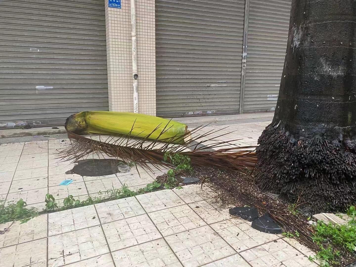 据我观察,这棕榈树平均一个星期总会有发现坠落的枯叶,偶尔也会砸中停在道路两旁的车辆。也发生过车给砸破玻璃,车身给砸坏等等。还好暂时没有发生砸中人受伤的事件。但为了安全,我还是建议移除该棕榈树改种其它树,或者要每周定期安排人对棕榈树快枯掉的叶子进行清理。保证行人的安全。