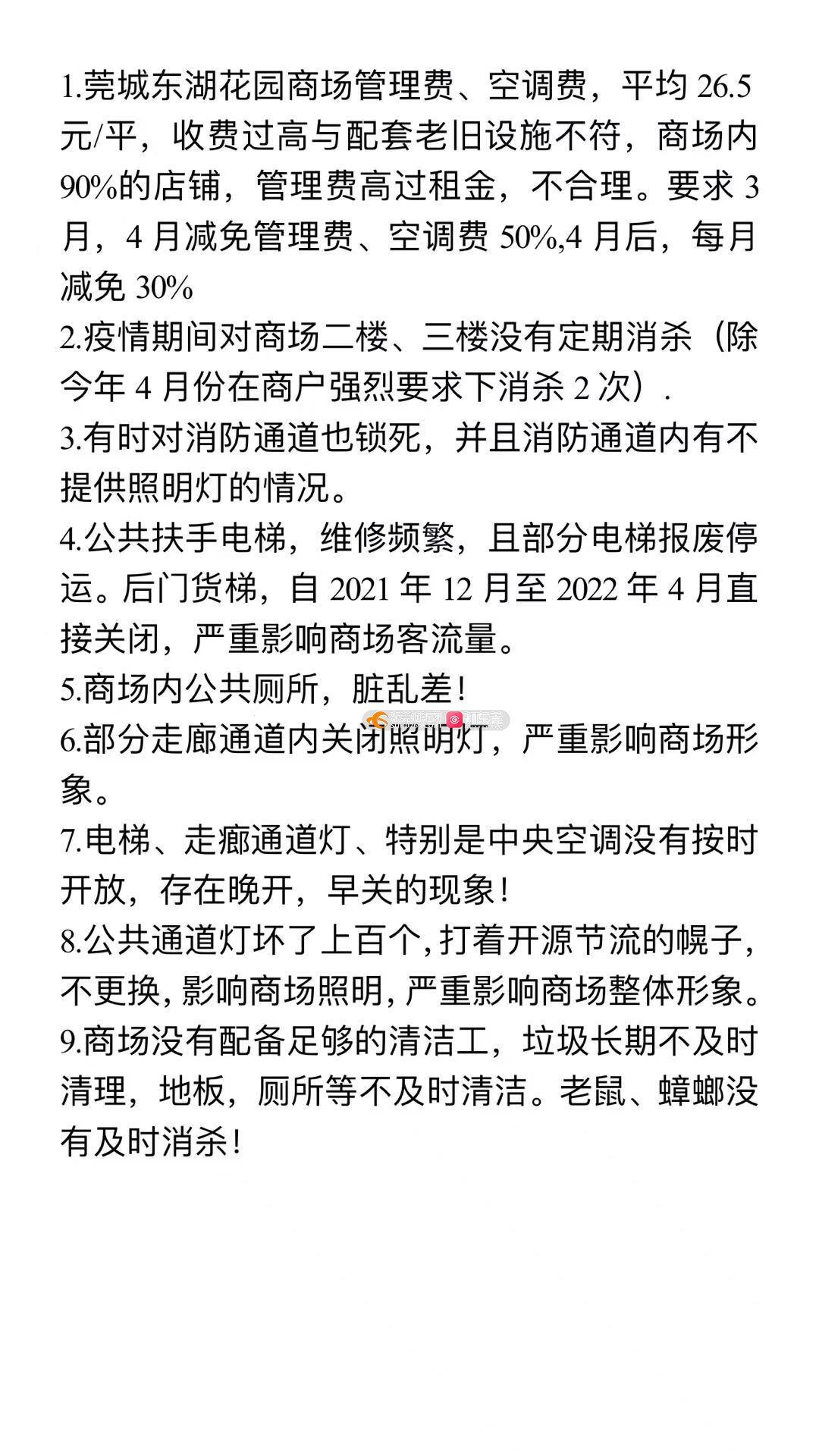 内容:东莞市莞城东湖花园商场管理费、空调费,平均26.5元/平,收费过高与服务质量、配套老旧设施不符。商城内90%的店铺,管理费高过租金,不合理。要求2022年3月,4月减免管理费、空调费50%,4月后,每月减免30%.