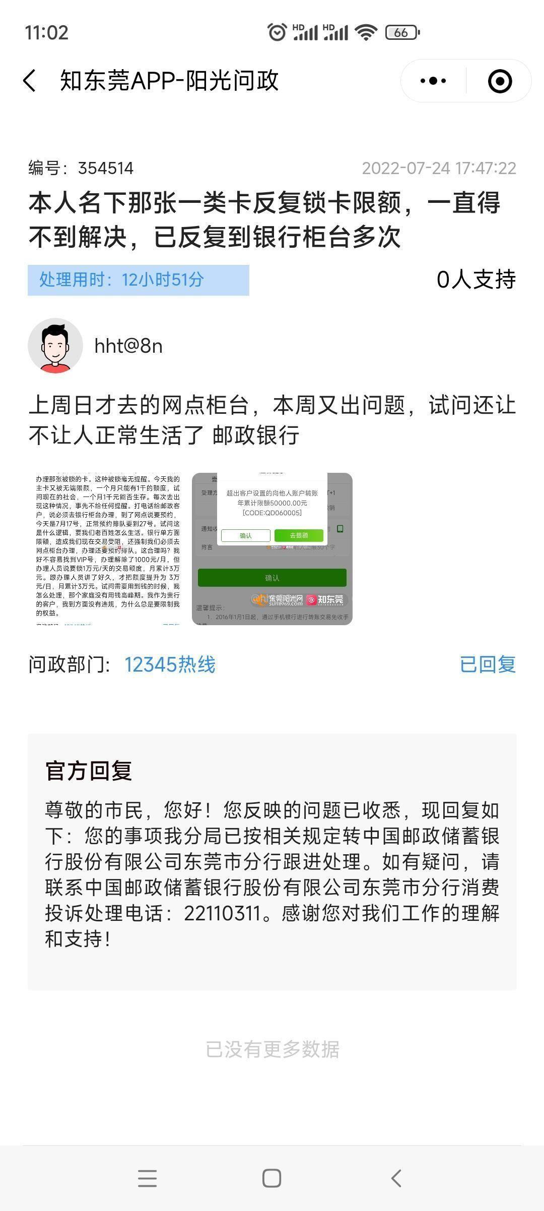 邮政一类卡反复被限额,一直未给予合理处理