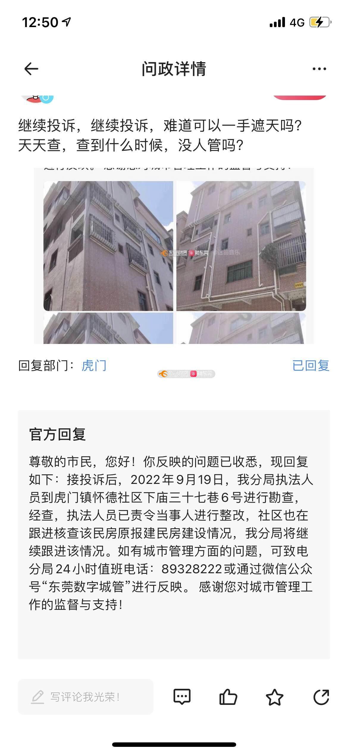 尊敬的市民,您好!你反映的问题已收悉,现回复如下:2022年9月26日,我分局执法人员到虎门镇怀德社区下庙三十七巷6号进行勘查,经查执法人员已责令当事人进行整改,社区也在跟进核查该民房原报建民房建设情况,我分局将继续跟进。如有城市管理方面的问题,可致电分局24小时值班电话:89328222或通过微信公众号“东莞数字城管”进行反映。 感谢您对城市管理工作的监督与支持!