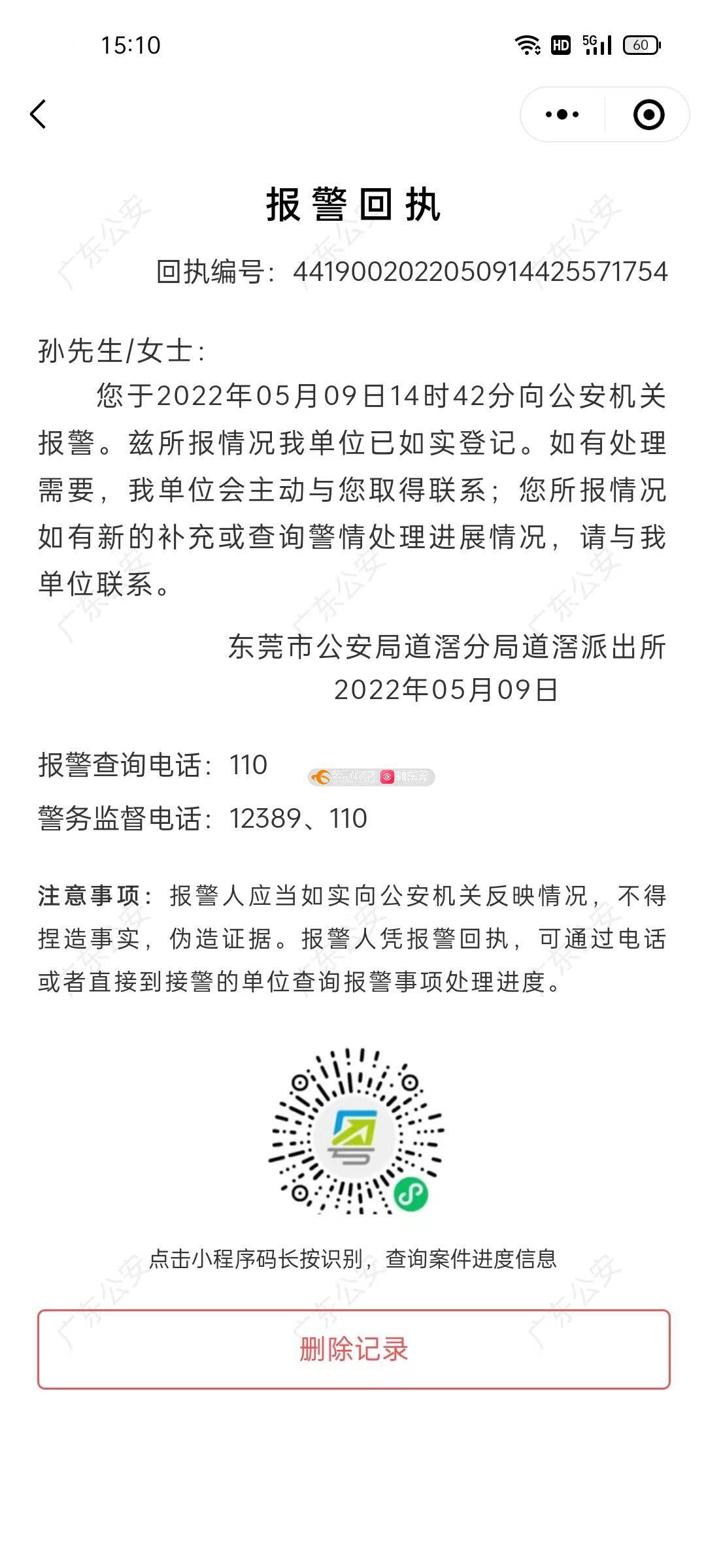 尊敬的市民,你好!您反映的问题已收悉,现回复如下:经查,市民孙先生于5月9日已到道滘公安分局报案,该案件编号为A4419635000002022056035,已开展立案侦查,目前该案件正加紧侦办中。 9月21日,工作人员通过电话方式向市民作出反馈,如市民需要开具证明,建议市民自行到道滘公安分局刑事侦查大队。如有疑问,请联系道滘公安侦察办案队,联系电话:0769-88835593,感谢您对我们工作的理解和支持。