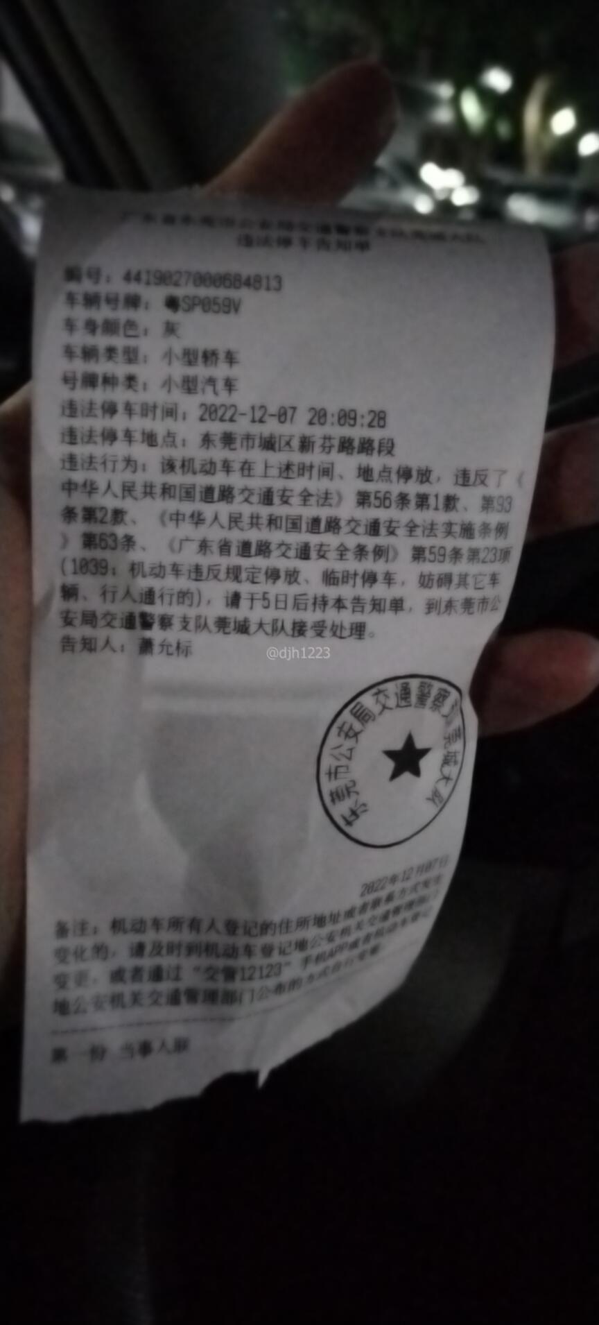 本人2022年12月7日晚上8点钟,驾驶车牌号为粤SP059V 小汽车,带小孩到位于莞城新芬路的新华书店购书,平时白天停放在旁边博物馆公共停车场内,由于超过规定的停车时间(18:00),所以就将车停放在图书馆的侧面停车场,但是在里面兜了一圈没有停车位,所以就将车停在了新华书店旁边的侧面小道上,20:09就收到莞城交警的违停罚单,针对这个罚单本人提出两点质疑: 1.违停时间是晚上 8点钟后,这个时间段的车流量非常少,根本就没有妨碍其他的车辆通行,其他车辆可以正常自由通行。执法部门存在过渡执法。希望执法能在阳光下运行,使我们的执法更加阳光。 2.对罚单上面所描述的违停地点有误,罚单上显示新芬路路段,新华书店的正门前面的路才是新芬路,如果停门前那就是违停,而本人停车地点是新华书店的侧面。是新芬通往停车场的小道(在地图上都没有名字)。这条路不属于公共道路,是内部道路。执法部门有滥用执法权的行为。 针对本人提出的问题,执法部门能够认真对待研究。今年是不平凡的一年,因为疫情百姓生活困难,生活在水深火热中,希望有关部门能够认真善待。