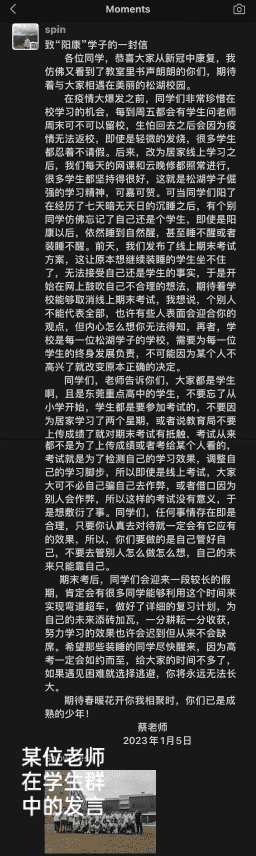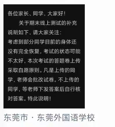从事实上看,东莞一中、莞中、莞外,甚至是东华,都采取线上自测自改,以作业形式上传的方式进行期末考试,有需要的同学可主动交卷给老师批改(可见下图)。可是东莞中学松山湖学校,依旧坚持云监考、上传试卷答题卡由老师改卷,并且考虑在学校系统中登记公布成绩。许多同学都还处于转阴不久或还在阳性之中,身体状况并未恢复。学校给出的考试理由如下:本次线上期末自测,是对本学期学生学习、教师教学情况的反馈总结,学校和学生正常情况下需要测试结果,为下一步的发展做好规划。请问在现在的情况之中,学生身体刚刚开始恢复,还处于虚弱状态中,学生考试状态甚至不能达到原来80%的水平、已经进行数十日的质量不高的网课、没有全面系统的完整复习…这样的考试成绩,是否真的具有参考价值?其参考价值显然不如前两次考试。从别的角度看,一部分学生并不希望考试,假如采取强制交卷由老师批改,试卷是否诚信作答,不得而知,云监考要真的想作弊,也是很简单的。而采取与上文几所学校的方式,那么上交的都基本上是自愿考试,对自己有一定要求的学生,这部分学生的成绩显然更具有对教学工作的研究参考价值。而那些不希望考试的学生则可选择较为轻松的完成试卷,自行订正后上传至钉钉,然后老师收齐检查试卷。这样的方式是否更聪明? 另外,在早些时候,我们当中的某位同学提出了对取消线上考试的请求,随后某位老师在学生群中发表了如下图的言论。从言论中不难看出,其并不尊重学生的个人身体健康等权利,请问正在阳中与刚刚开始恢复的学生是否就是那些“装睡的人”?身体还没有恢复,难道就不能当一名学生了吗?学生合理提出自身诉求,就是“鼓吹不合理想法”或“因为自身不高兴要求学校作出改变”吗?这显然不应该是一位老师对待学生们该有的态度。这位老师对学生的一番苦心我们可以理解,也知道现在学业上的压力与竞争很大,学习成绩上去了,才能有更好的人生出路。但老师与学生之间的关系应该是亦师亦友的,更何况是在东莞中学松山湖学校这样一所名校。这样的发言,真的有失风度了。 借用之前发出请求哪位同学的一句话,“疫情不是任何人的错”,如果没有疫情,哪有学生会如此抵触这样一次考试?疫情对每个人的影响都不言而喻,学生亦是如此。如果不是因为疫情打乱了学生的学习计划,破坏了学生的学习进度,大家的意见肯定不会这么大。学生不应该进一步成为疫情的受害者。 希望东莞中学松山湖学校可以采取与莞中,一中,莞外,东华等学校的做法,采用自测自改,有需要上交老师改卷,以作业形式上交的做法。