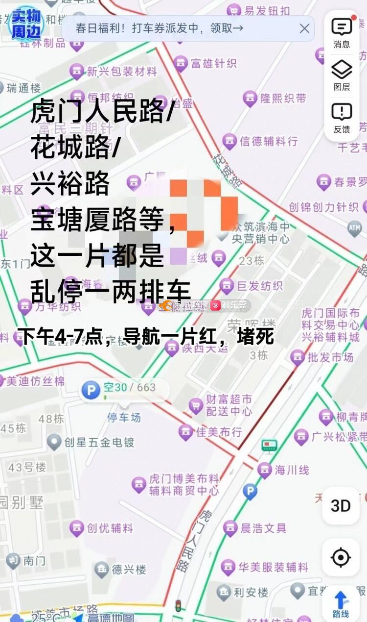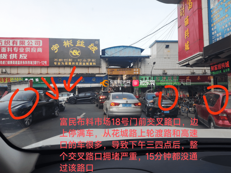 1.兴裕路,双向4车道,下午就占用了两车道,一半截停满车,在门口上下布料,另外一半截停满小摊位。下午5点接送小孩放学,电动车都堵的骑不动。路两边的骑车车道也停满车 2.虎门人民路布料市场这一段,双向4车道,两边也占用两车道违停 3.宝塘厦路和花城路两边也违停,花城路本就两车道,并且此路上下轮渡路和高速车流量大,每到下午4点后拥堵严重 4.花城一路和虎门人民路交叉路口,下午摆摊车导致拐进和拐出都有安全隐患,并且造成拥堵。 以上布料市场周边路段(兴裕路,虎门人民路,花城路,宝塘下路)望能设置交通技术监控设备,进行严管,自动拍照记录违停(因为贴违停贴纸已经不起作用,每台车基本都有贴,但每天如此违停)。对于占用车道摆摊的派人管理。 新联新泰路末端靠近新旺路都装了违停抓拍,那里车流量那么少,这些路段车流量大,拥堵严重,不装违停抓拍实在太不合理。请派人下午5点去看看这些路段违停拥堵情况,并从根本上解决问题,而不是管一两天后,又出现这种状况