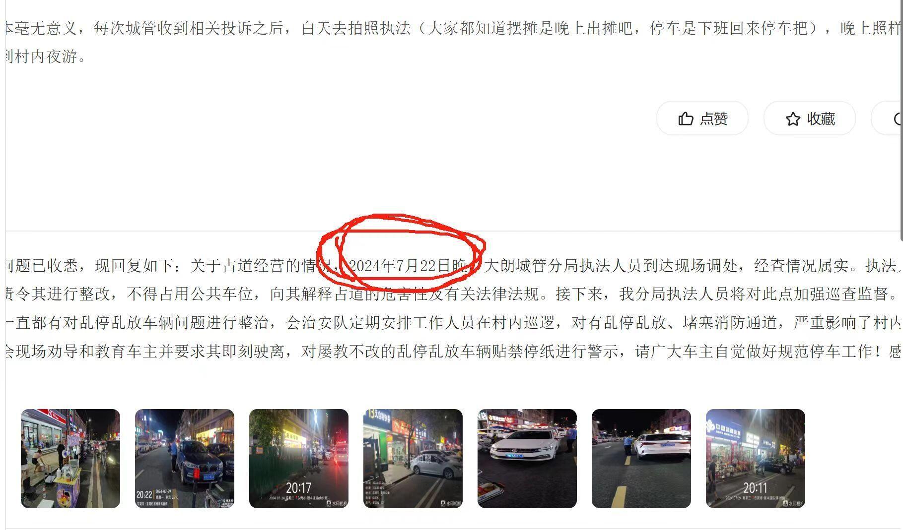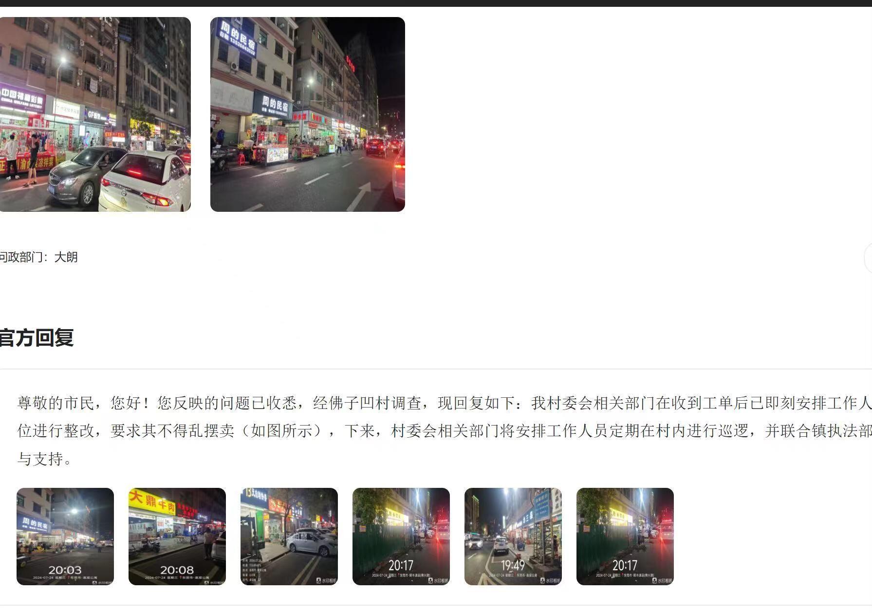 1.针对目前大朗佛子凹佛兴路商户乱占道摆摊问题和乱停车问题,分别有发布了两条问政。(虽然个人也知道这个并没有什么作用,但是报着能做一点是一点的心态,还是反馈了)。 2.相关部门回复两条问政,拍的图片时间都是7.24日8点,证明部门人员工作虽然忙碌,也是懂时间管理的,可以把几件事计划到一起办了。 3.但是其中就有一些疏漏了,其中一条文字回复是关于占道经营的情况,2024年7月22日晚,大朗城管分局执法人员到达现场调处,经查情况属实。并责令商家整改,实际附上的整治图片也是7.24日的,下次就要注意了。 4.还有一点就是,7.24日确实在拍照的时候整改了,但是也希望后面工作人员多去巡逻哦,不然7.25 7.26后面还是这样子的。谢谢!